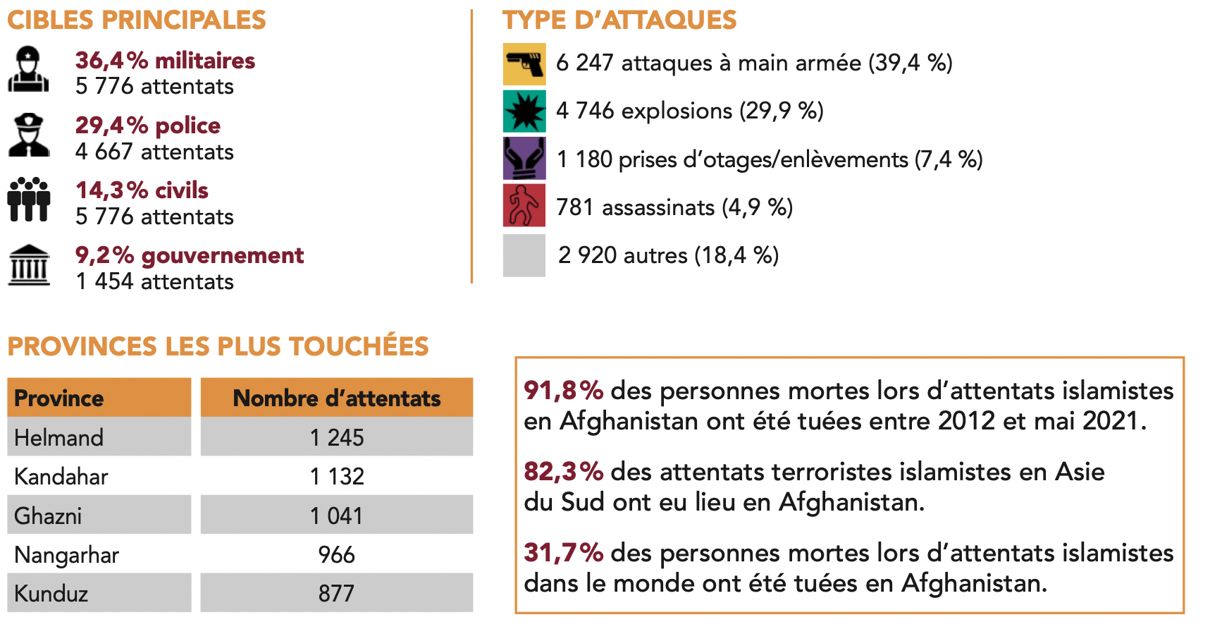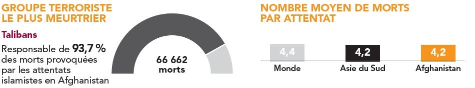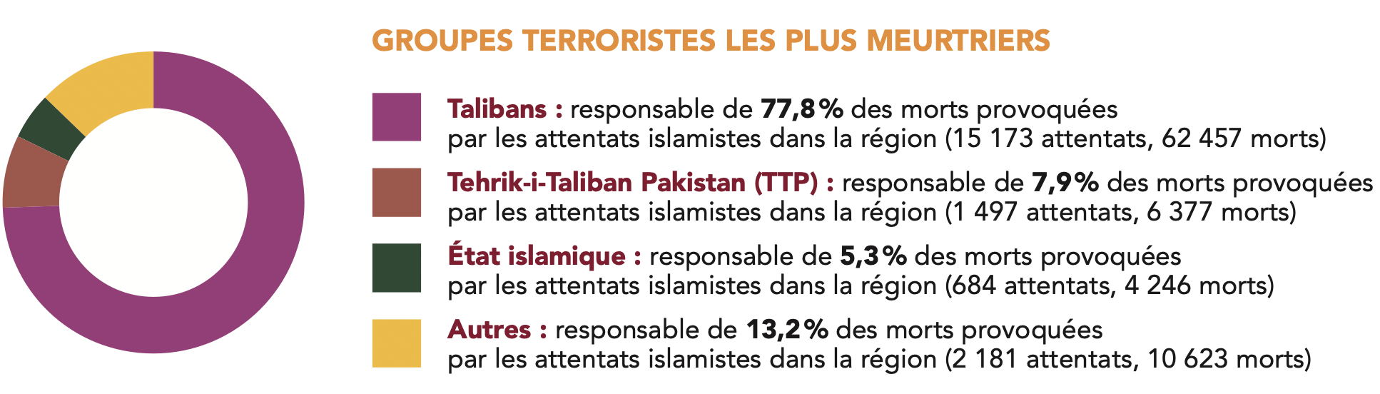 Sur l’ensemble de la période étudiée, les talibans ont été le groupe le plus meurtrier. Ses actions terroristes ont provoqué la mort de 69.303 personnes.