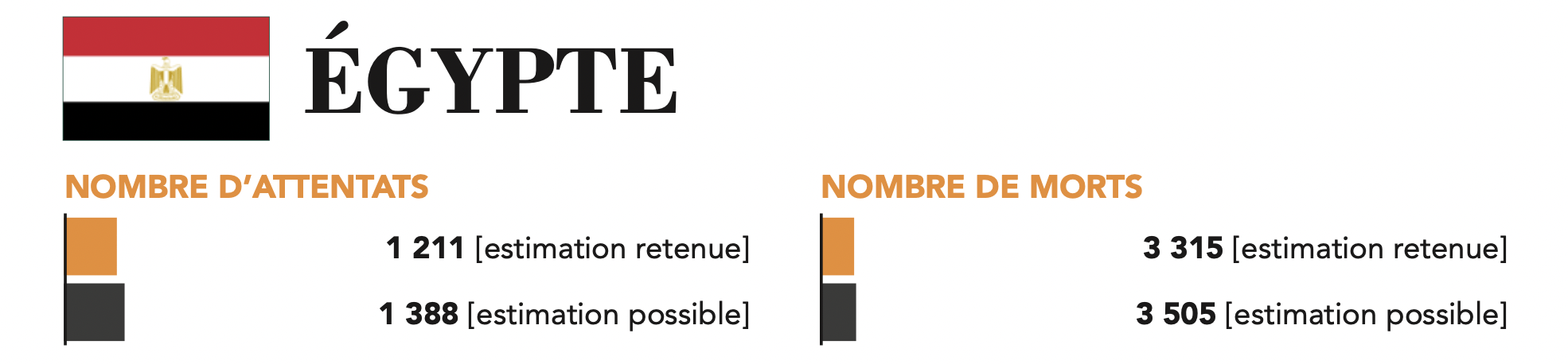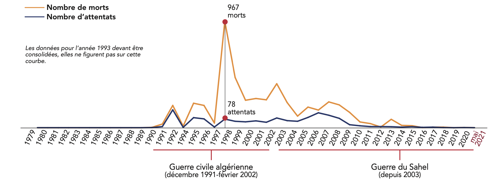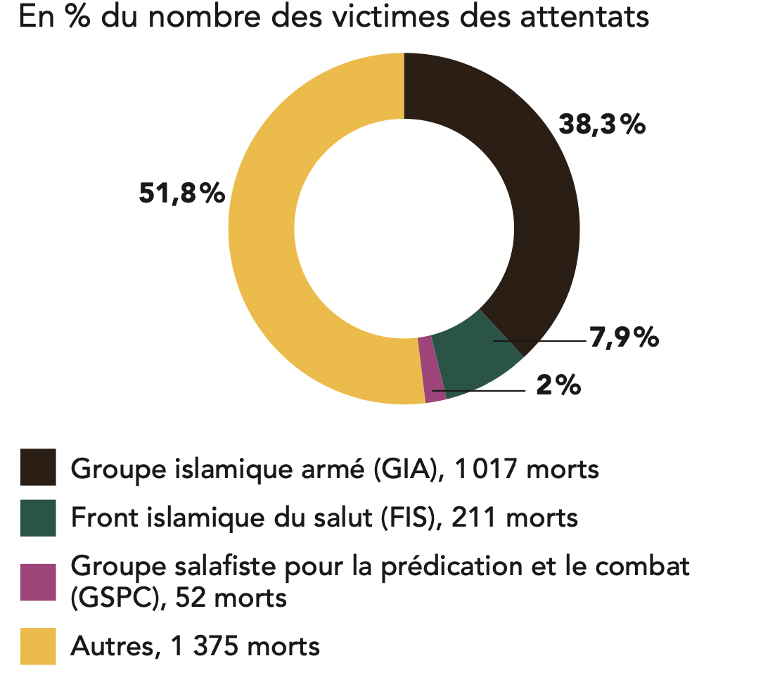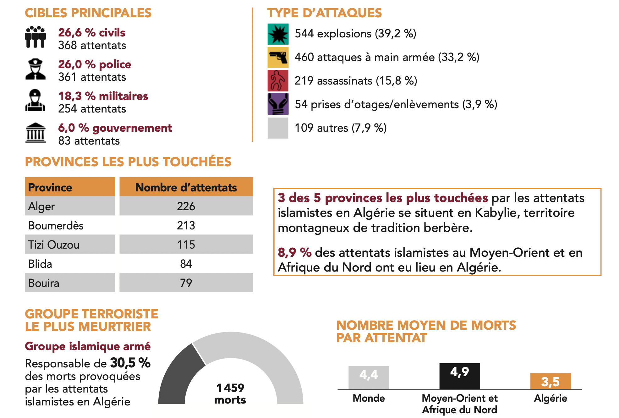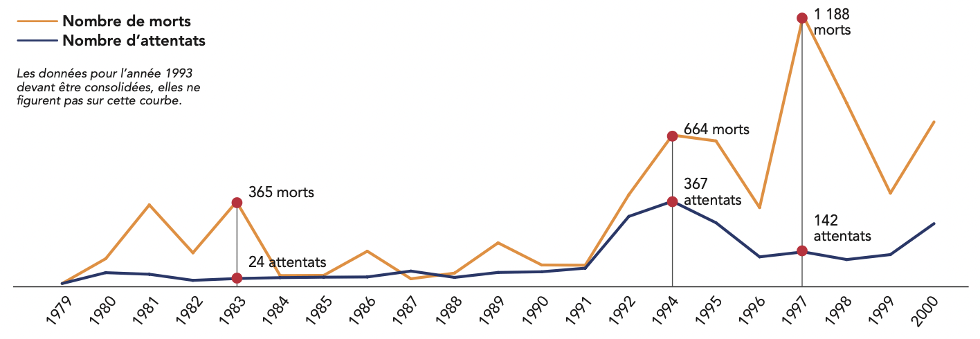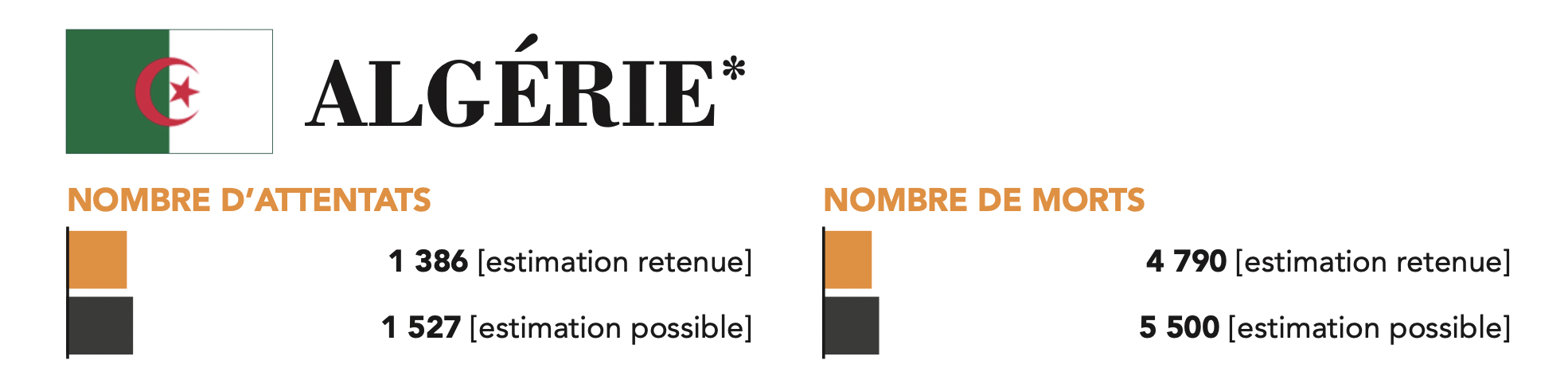 *Cette fiche pays ne peut pas prendre en compte les estimations de la décennie noire de 1991 à 2002 qui selon les sources varient entre 44.000 morts et 200.000 morts du terrorisme islamiste.