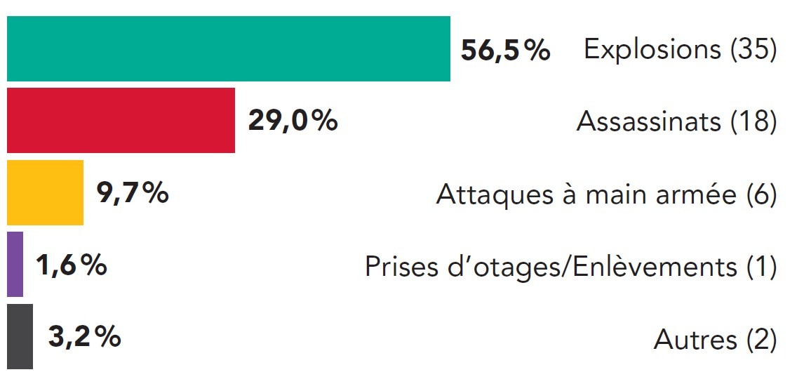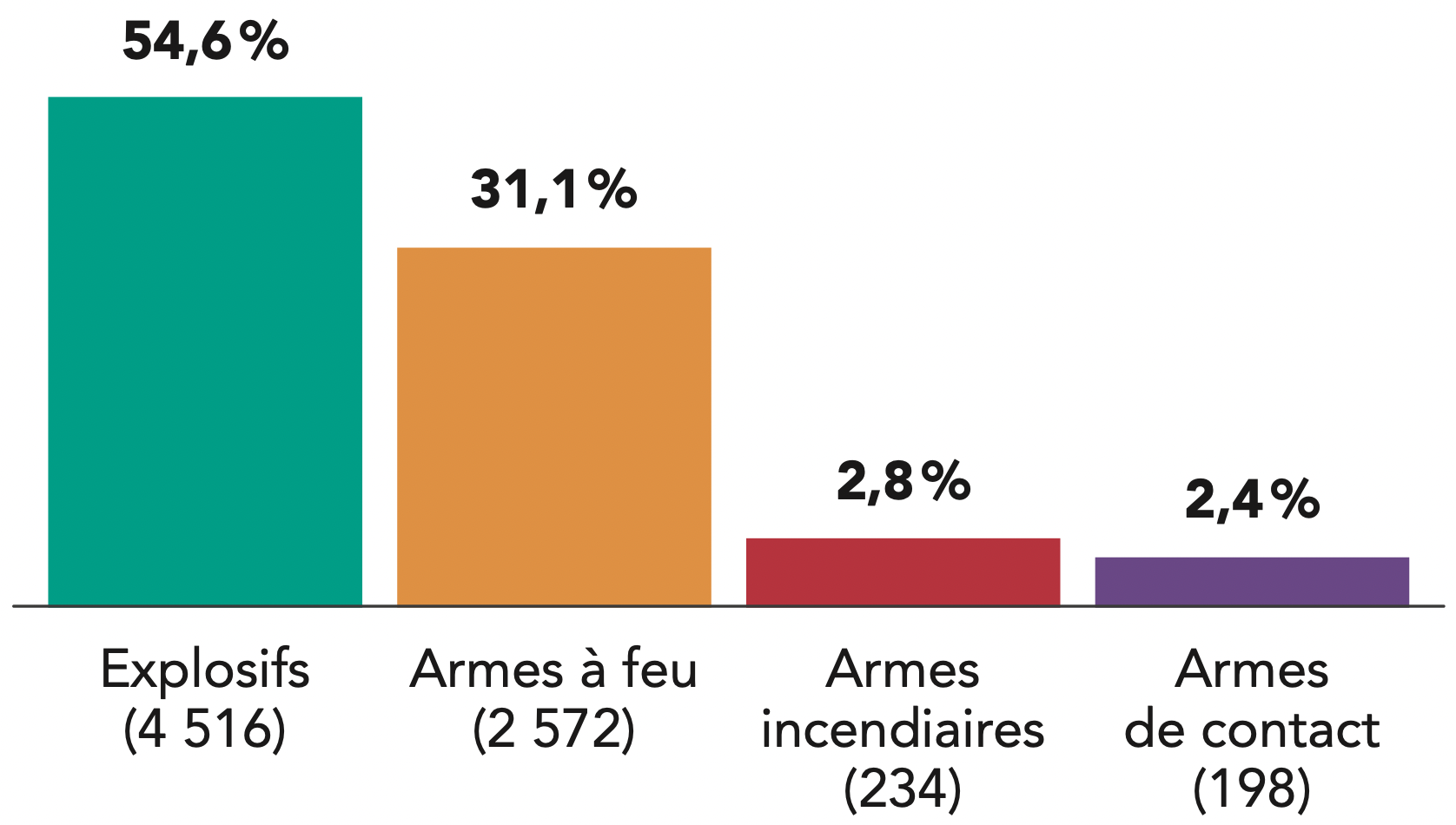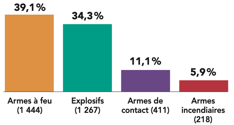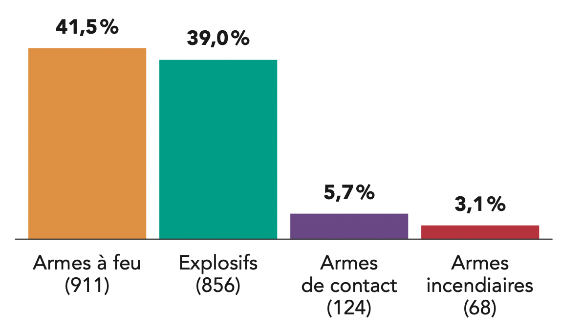 Les explosifs sont le type d’arme le plus utilisé (43,9% pour 21.082 attentats), suivi par les armes à feu (16.649 attentats), les armes de contact, comme les couteaux ou les machettes (2.120 attentats) et les armes incendiaires (960 attentats).