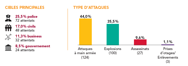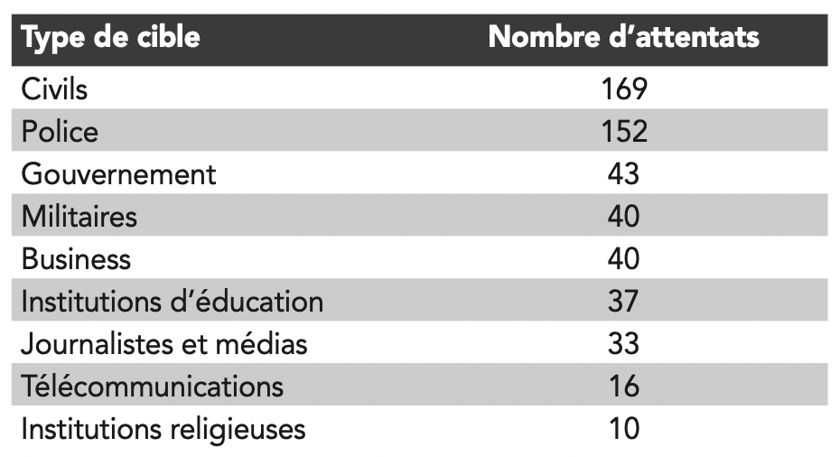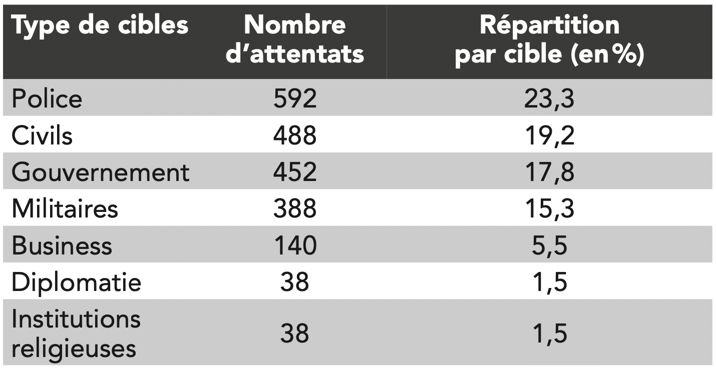 • 2001-2012 : civils (2.169 attentats, 26,2%), militaires (1.411 attentats, 17,1%), forces de police (1.427 attentats, 17,3%).