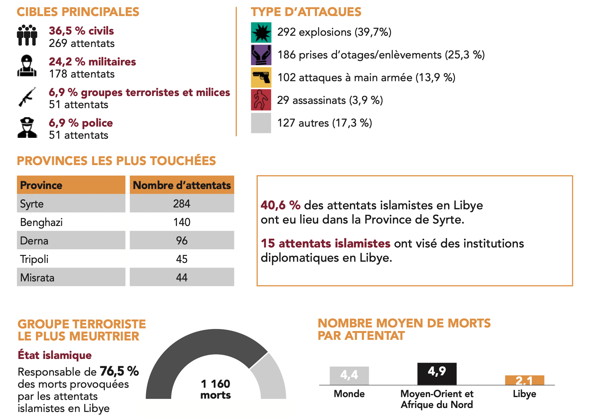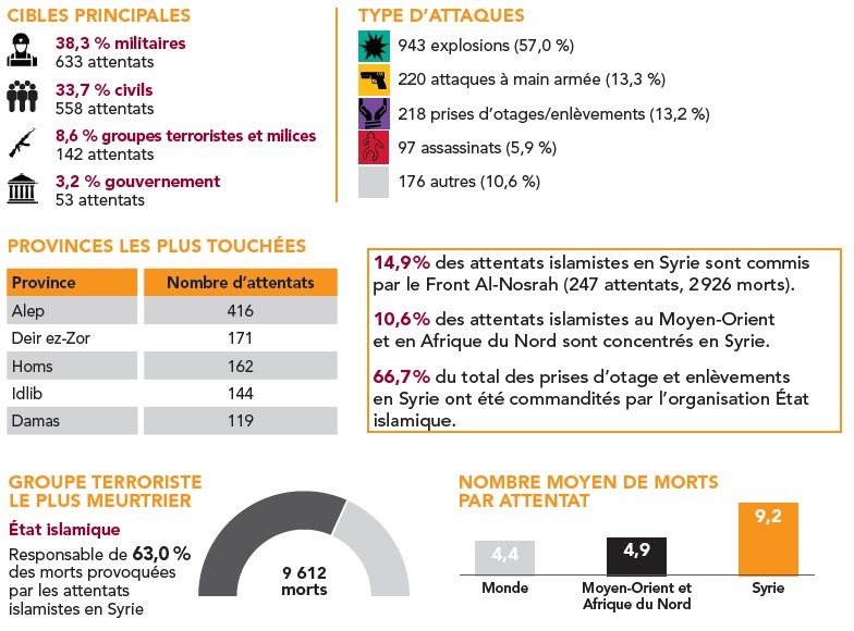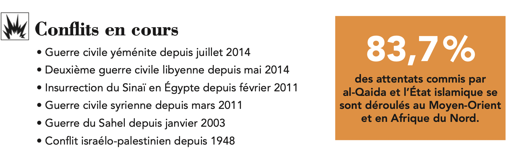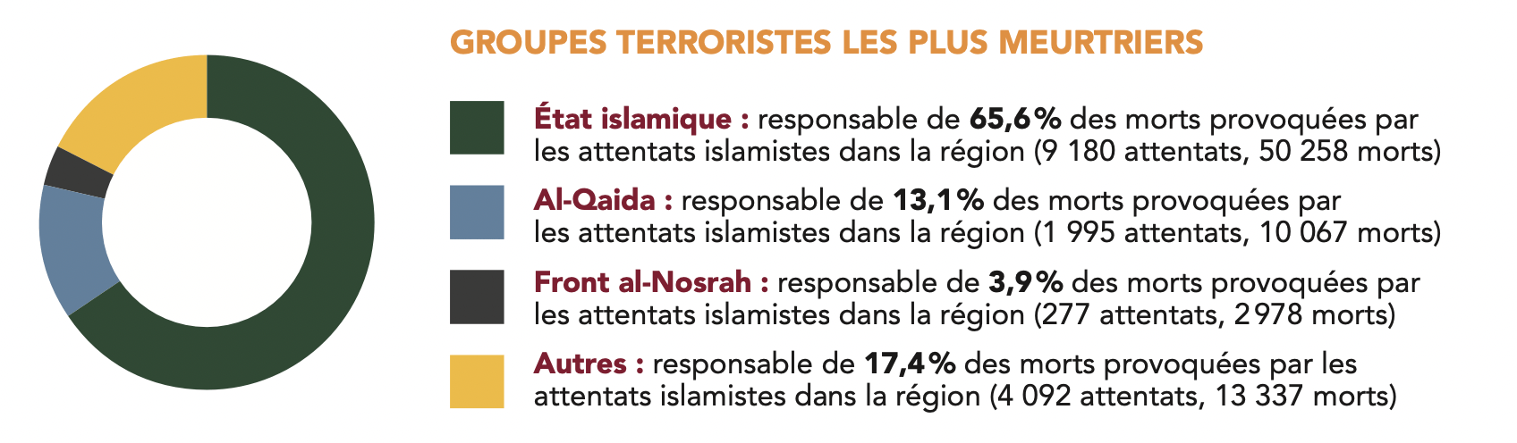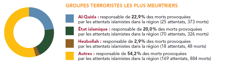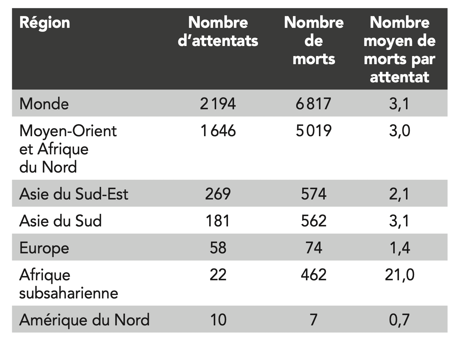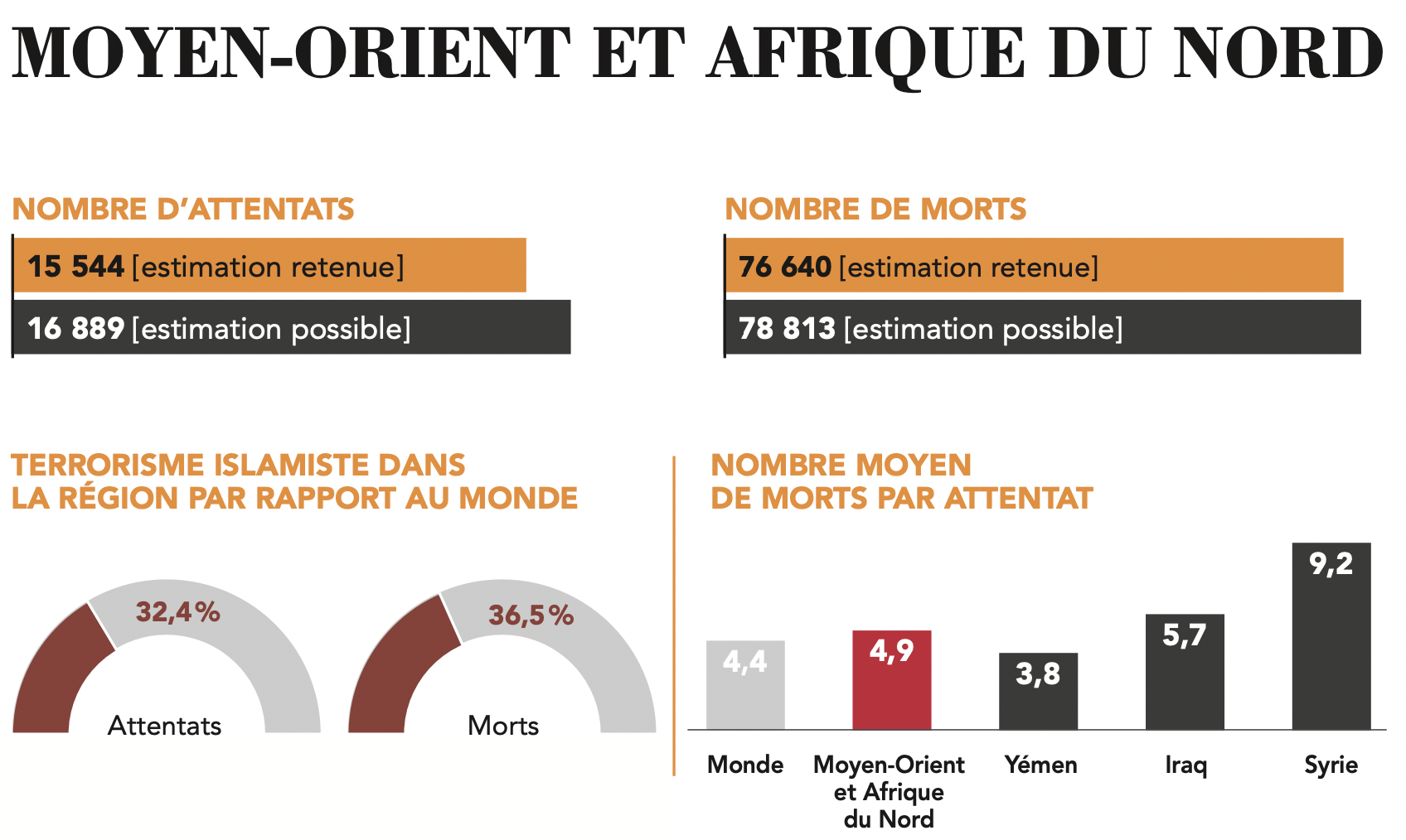 • Moyen-Orient et Afrique du Nord : 32,4% des attentats, 36,5% des morts.