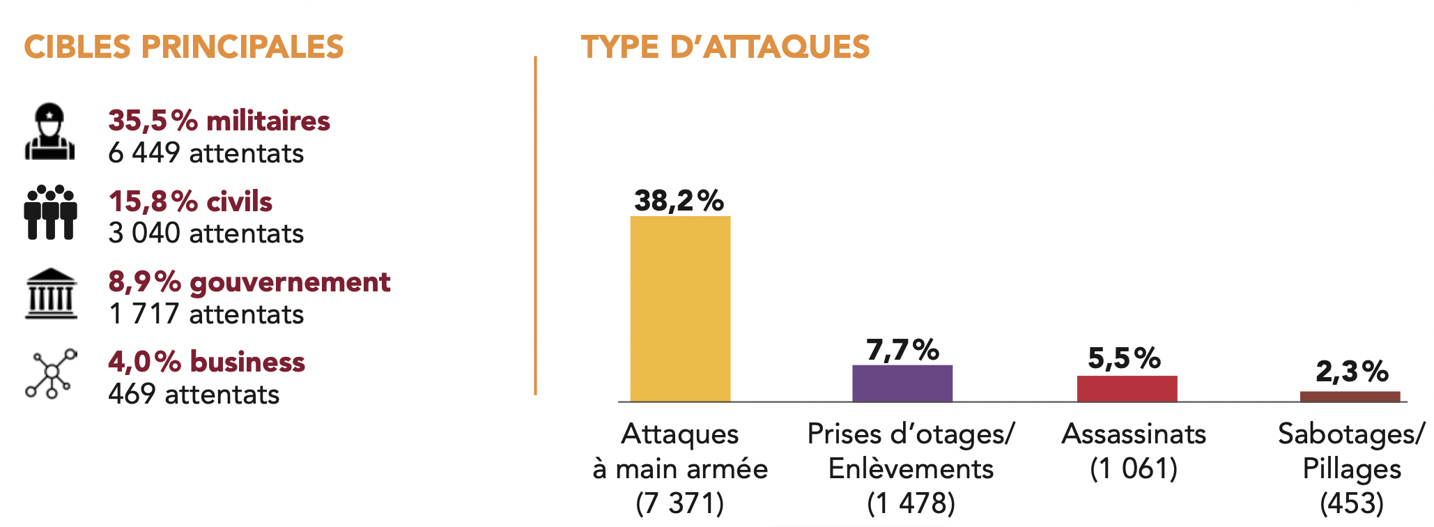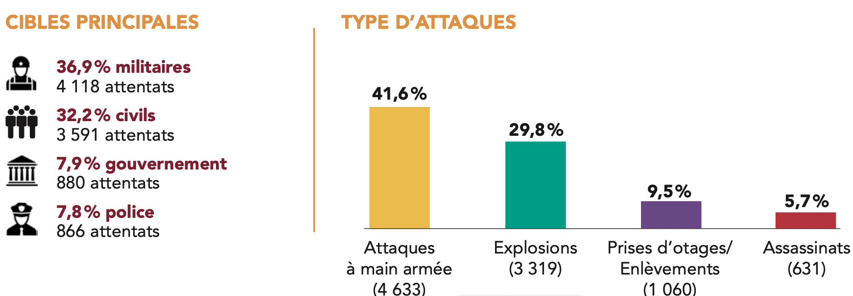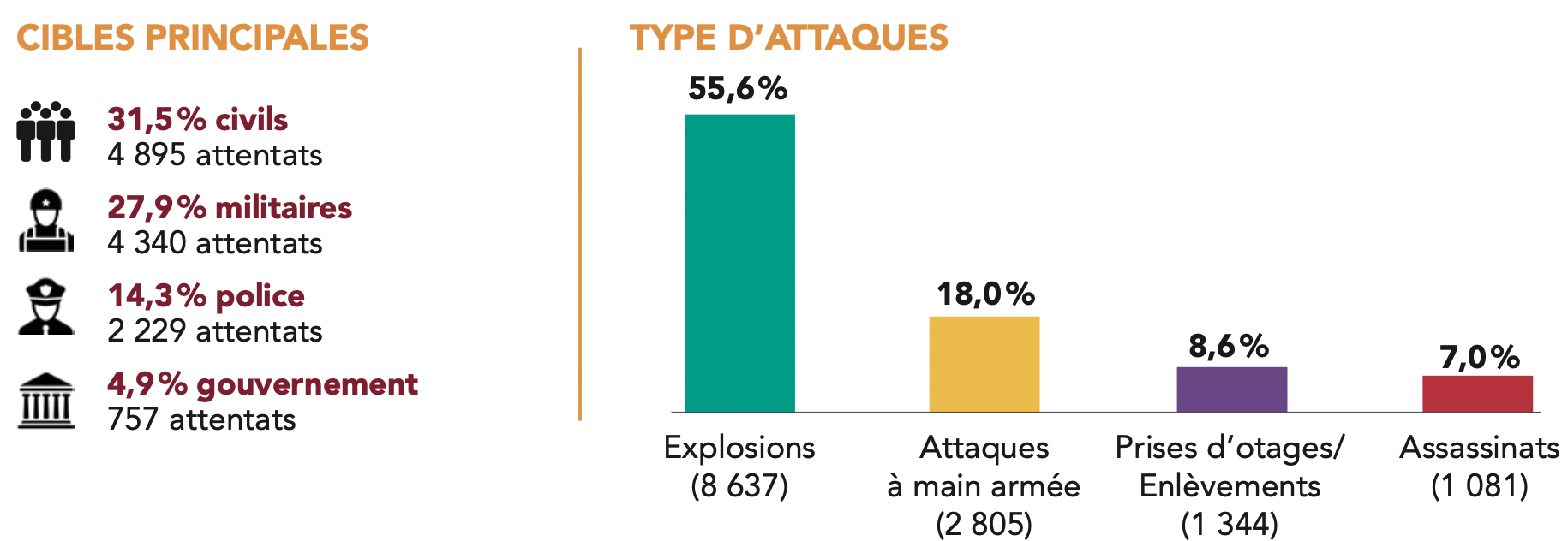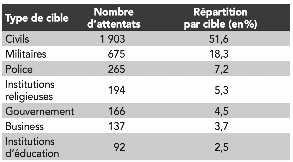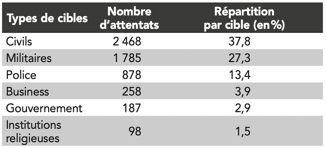 • 2013-mai 2021 : militaires (13.476 attentats, 35,9%), civils (9.420 attentats, 25,1%), forces de police (6.937 attentats, 18,5%).