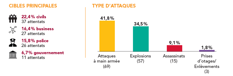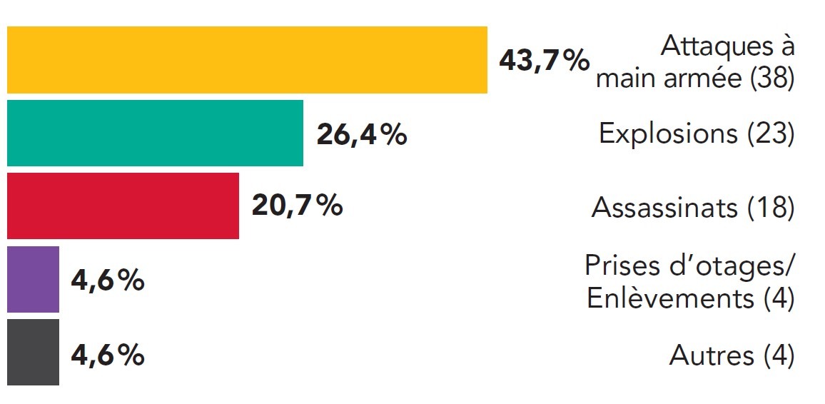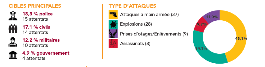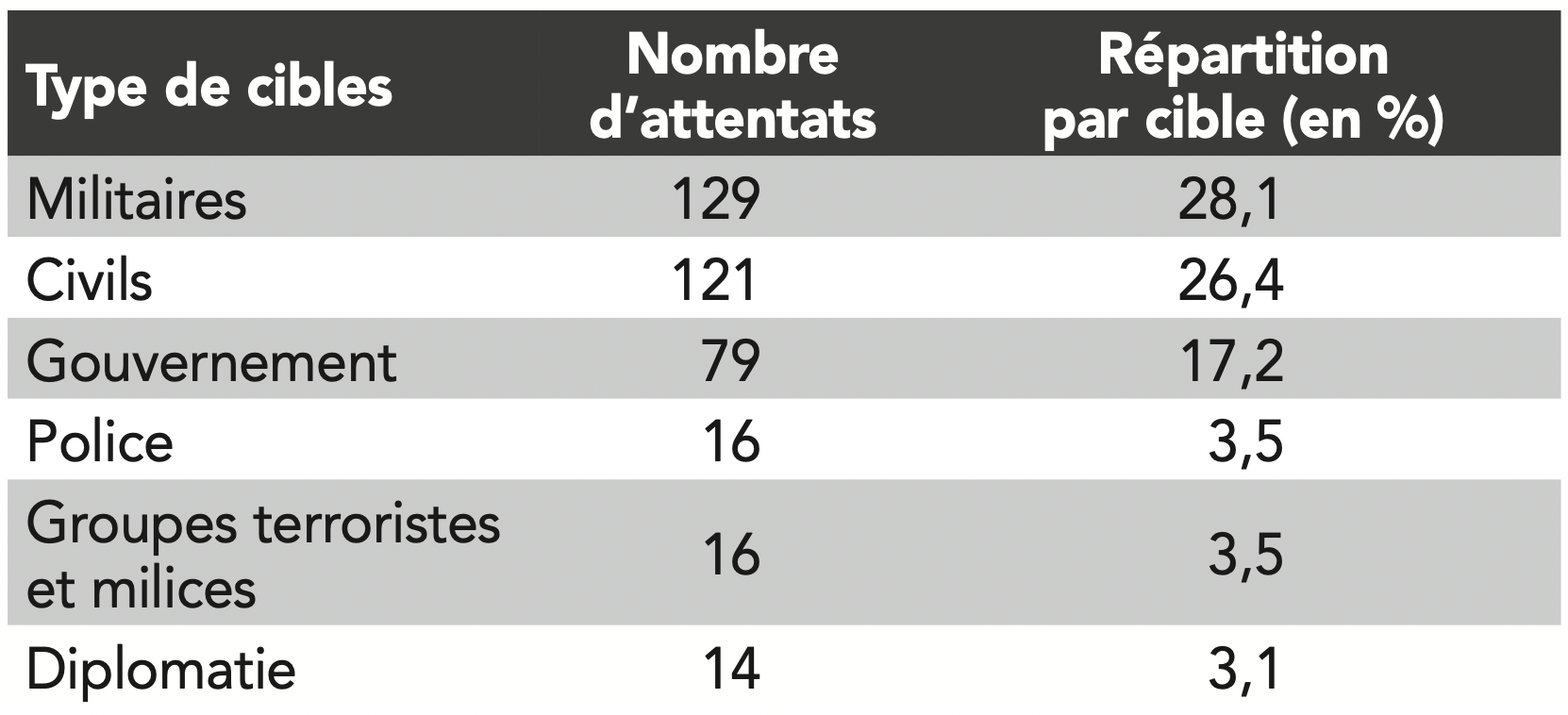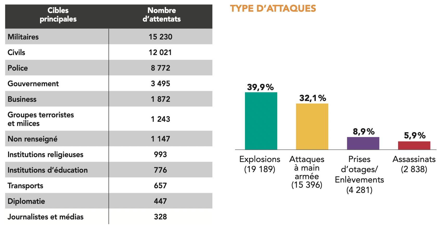 • 2013-mai 2021 : militaires (13.476 attentats, 35,9%), civils (9.420 attentats, 25,1%), forces de police (6.937 attentats, 18,5%).