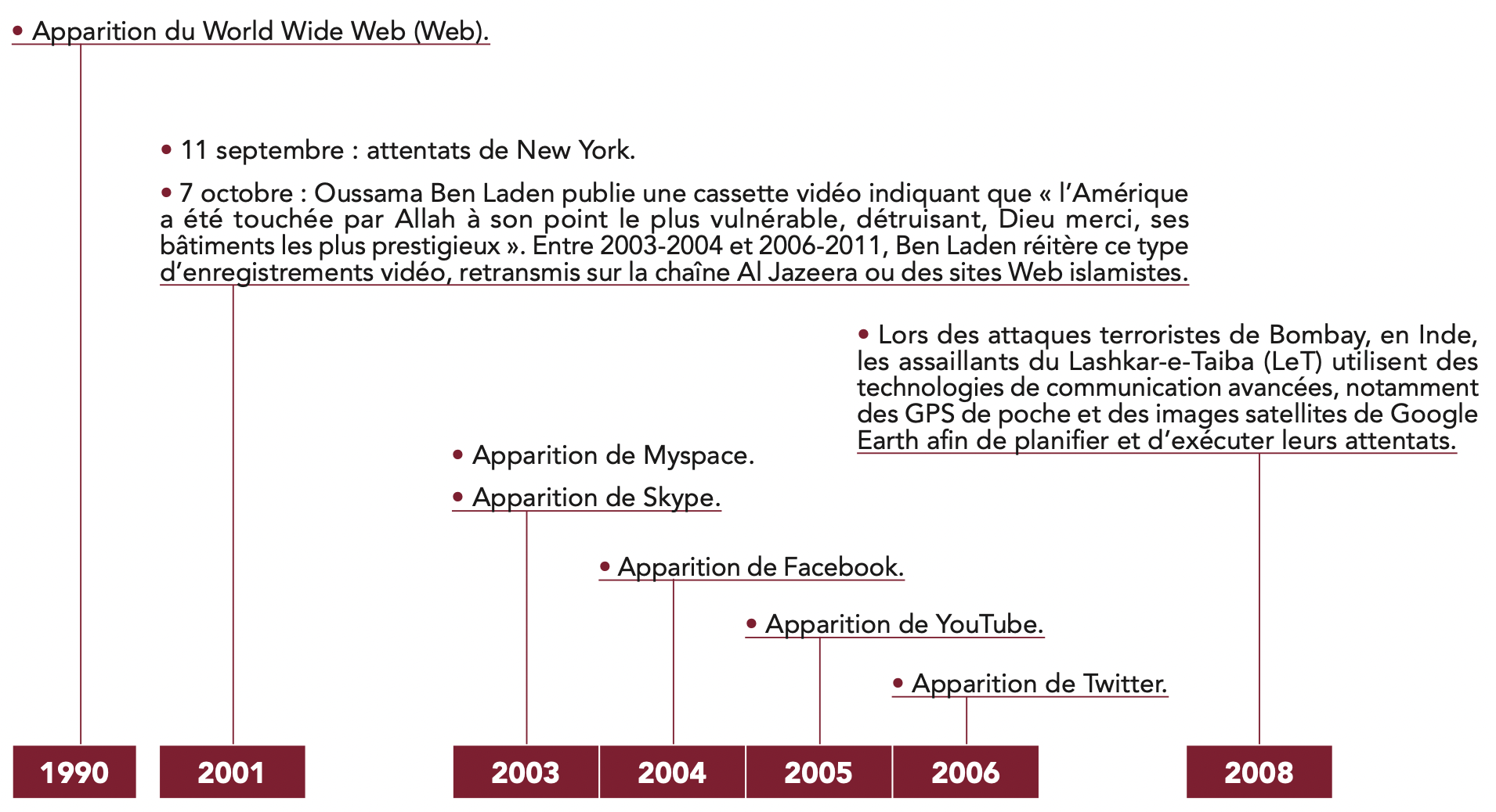 Internet joue évidemment un rôle clé dans la globalisation du terrorisme islamiste. Il se révèle un outil redoutable de propagande et de recrutement7. L’apparition des réseaux sociaux permet aux groupes islamistes d’interagir de façon efficace et souvent anonymement, de partager des documents et des informations, mais également d’établir une communauté d’individus reliés entre eux. Selon Evan Kohlmann, « 90% des activités terroristes sur Internet ont aujourd’hui lieu sur les réseaux sociaux. Ces forums servent de pare-feu virtuel pour protéger l’identité des utilisateurs et leur offrent une chance d’entrer directement en contact avec des représentants du terrorisme [trad.]8 ». Enfin, le cyber- terrorisme est aussi une modalité d’attaque pour les groupuscules islamistes qui démultiplient ainsi leurs capacités d’action.