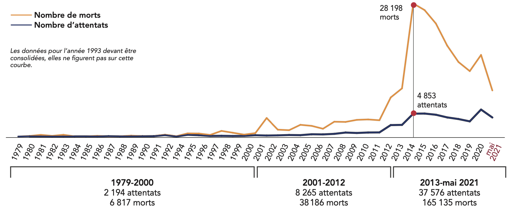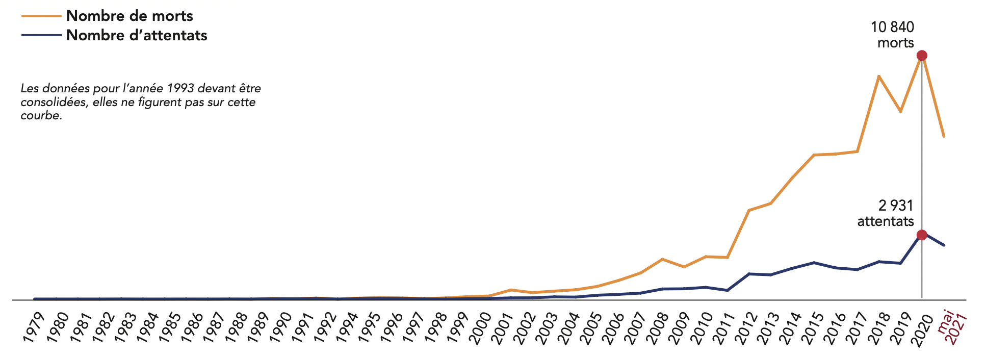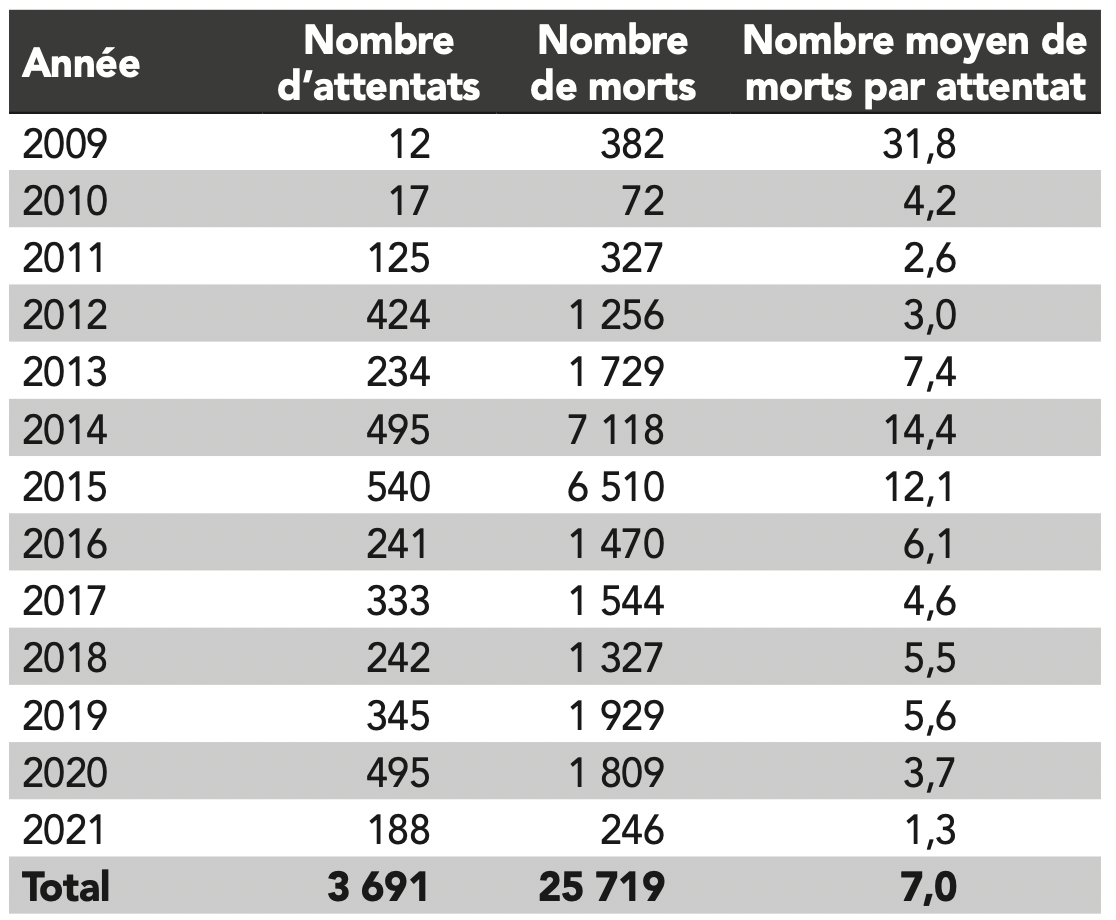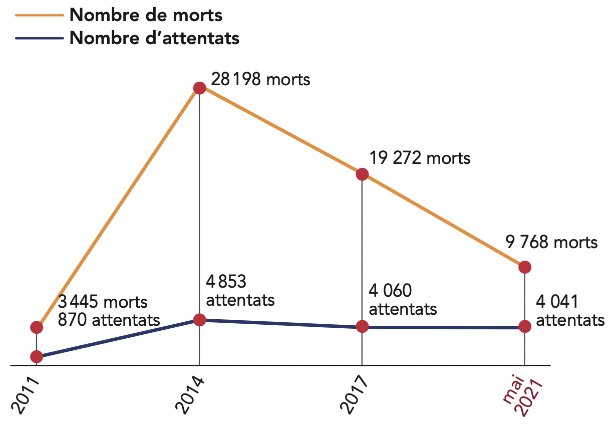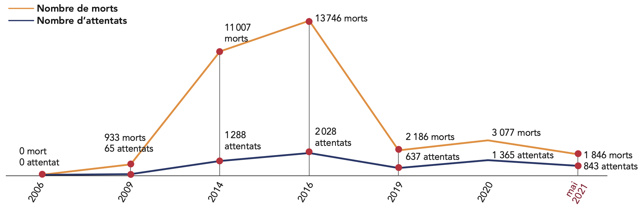 • 2013-mai 2021 : 37.576 attentats et 165.135 morts.