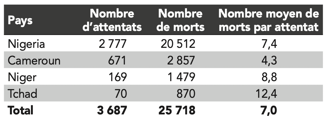 Entre 2009 et mai 2021, Boko Haram a été responsable de 3.691 attentats. Le bilan humain (25.719 morts) est particulièrement cruel. Un nombre important de réfugiés ont fui leur ville, voire leur pays. Des femmes et des enfants ont même été kidnappés afin de servir l’organisation terroriste, comme ce fut le cas en avril 2014 de 276 lycéennes enlevées à Chibok (Nigeria).