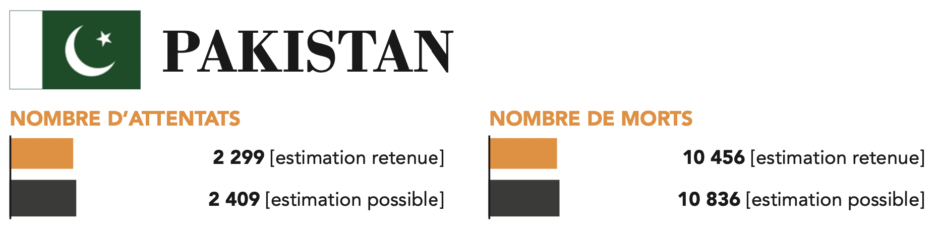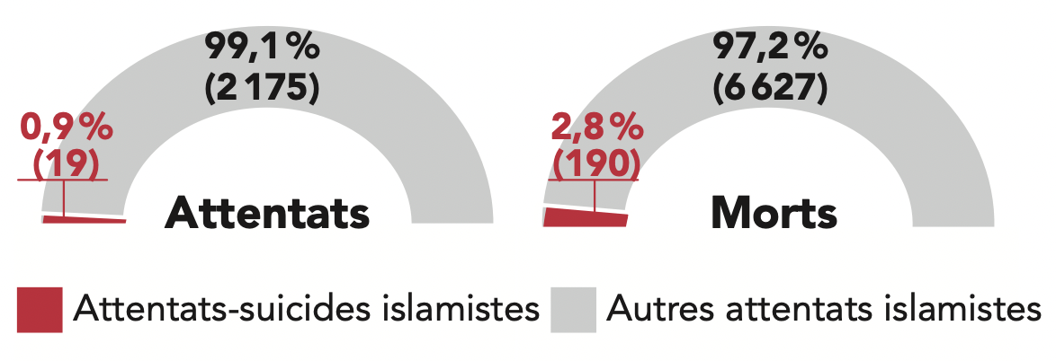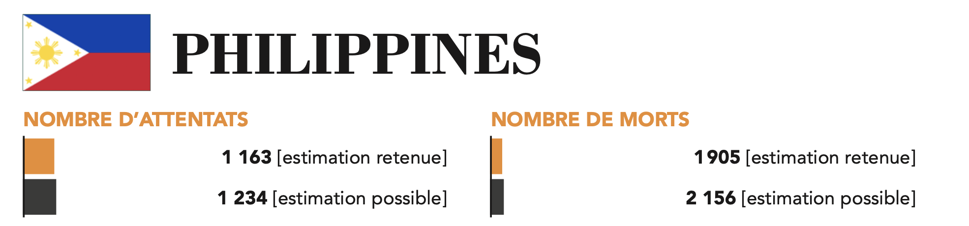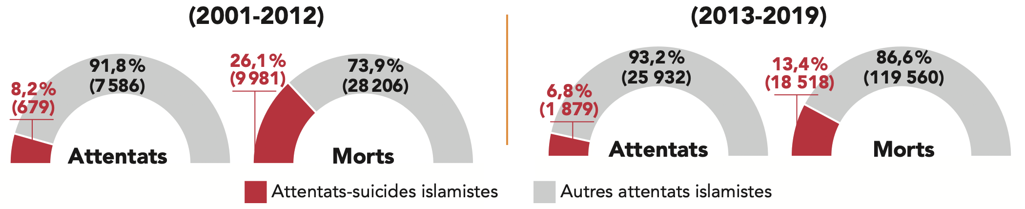 Notons que ces chiffres sous-estiment la réalité puisqu’ils ne prennent pas en compte les attentats islamistes perpétrés dans des pays à majorité non musulmane où des populations musulmanes sont concentrées dans certaines provinces. C’est, par exemple, le cas du sud de la Thaïlande où les musulmans sont majoritaires dans les provinces de Satun, Yala, Pattani et Narathiwat, mais aussi aux Philippines, 1dans la région de Mindanao ; en Inde, dans la province de Jammu-et-Cachemire ; ou encore en Chine, dans la région autonome ouïgour du Xinjiang.