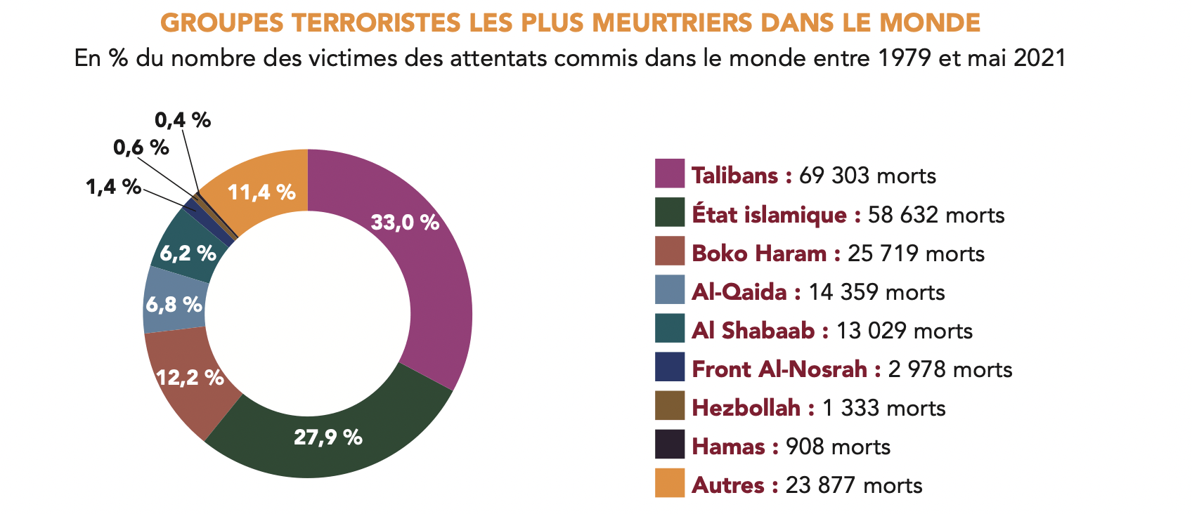 Les organisations terroristes les plus meurtrières, en prenant en compte leurs différentes ramifications, ont été les talibans (69.303 morts), le groupe État islamique (58.632 morts), Boko Haram (25.719 morts) et al-Qaida (14.359 morts). Ces quatre groupes terroristes ont été responsables de plus des trois quarts (80,0%) des victimes d’attentats islamistes entre 1979 et mai 2021.