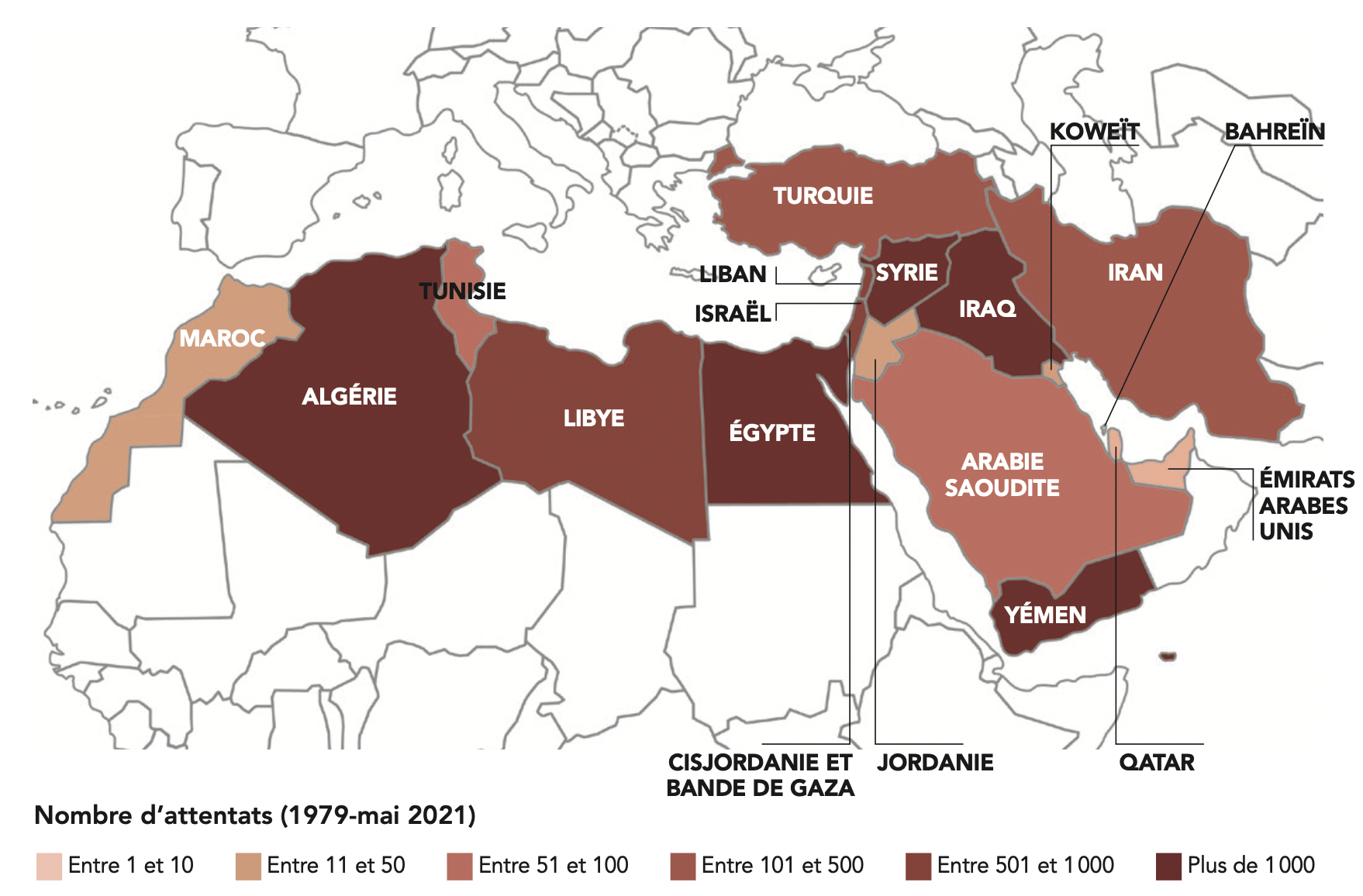 Le Moyen-Orient et l’Afrique du Nord, l’Asie du Sud et l’Afrique subsaharienne ont concentré 95,7 % des attentats islamistes entre 1979 et mai 2021.