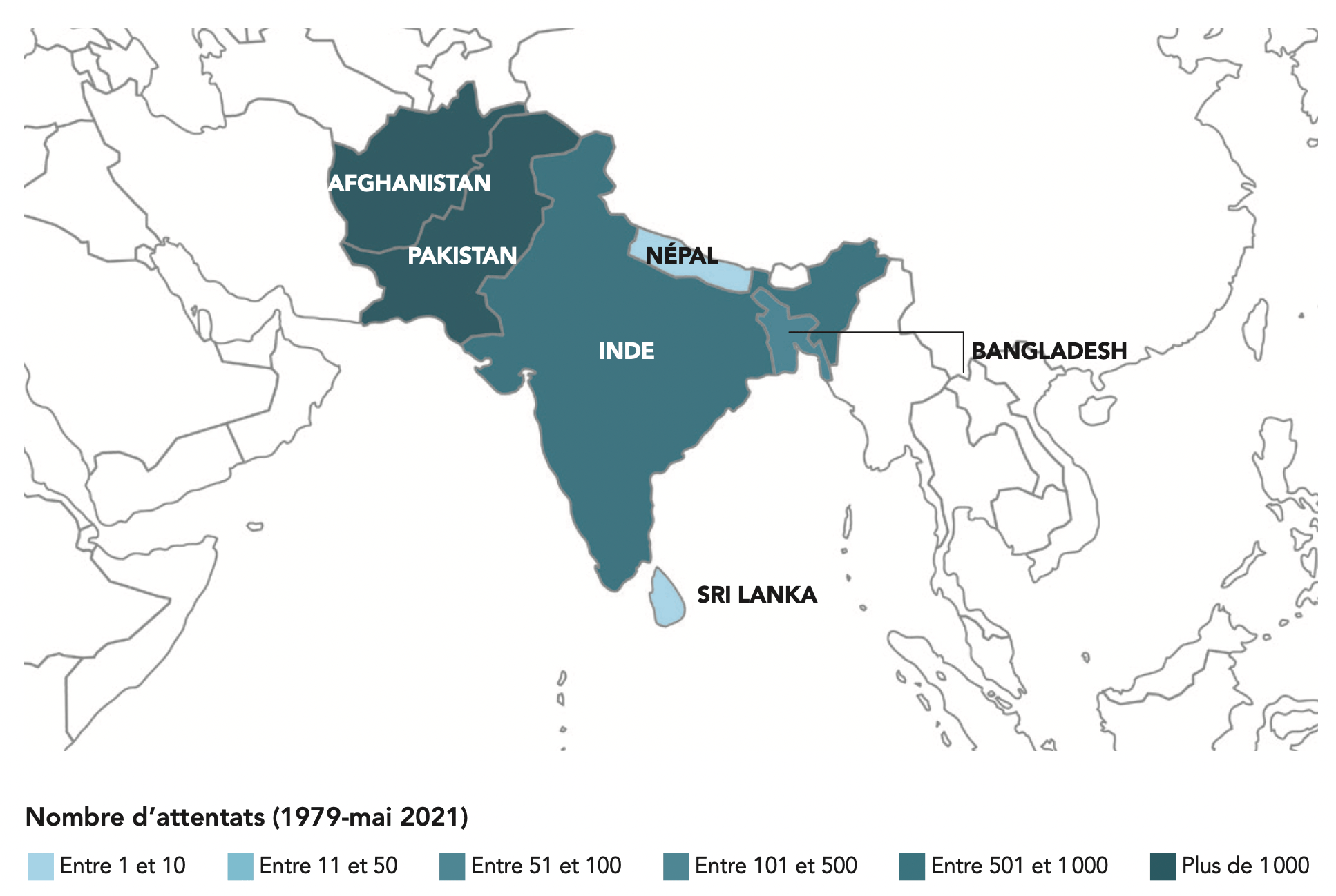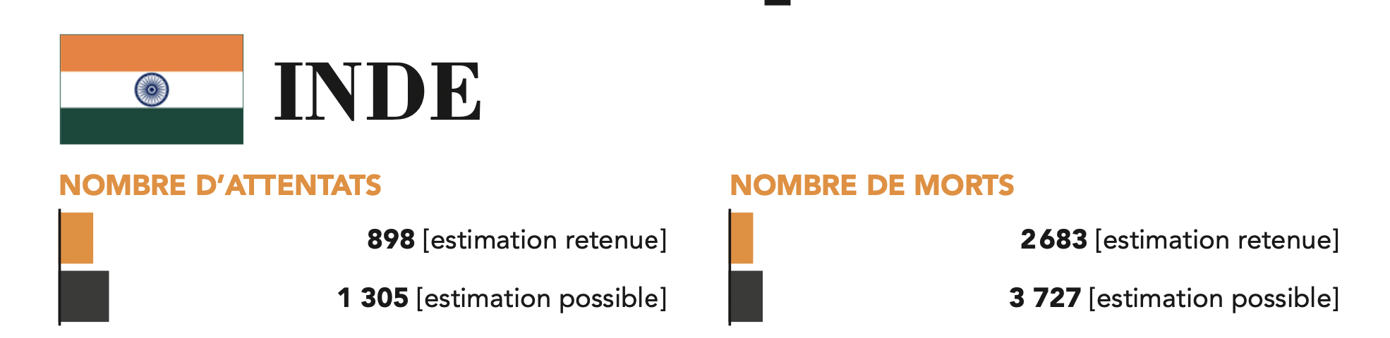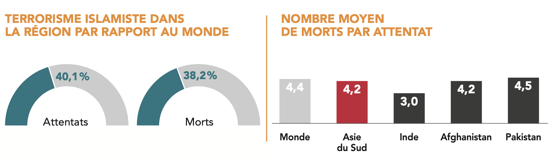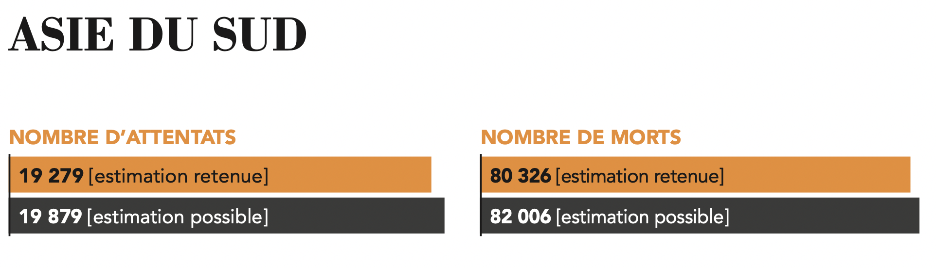 • Asie du Sud : 40,1% des attentats, 38,2% des morts.