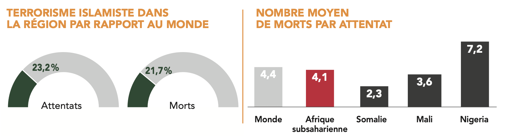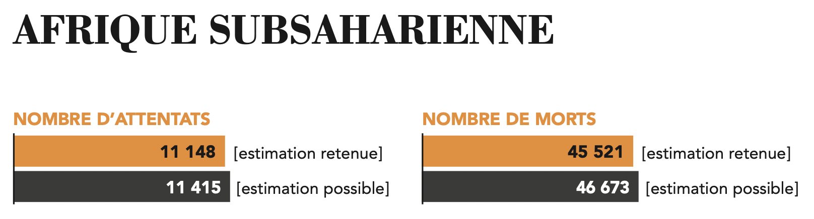 • Afrique subsaharienne : 23,2% des attentats, 21,7% des morts.