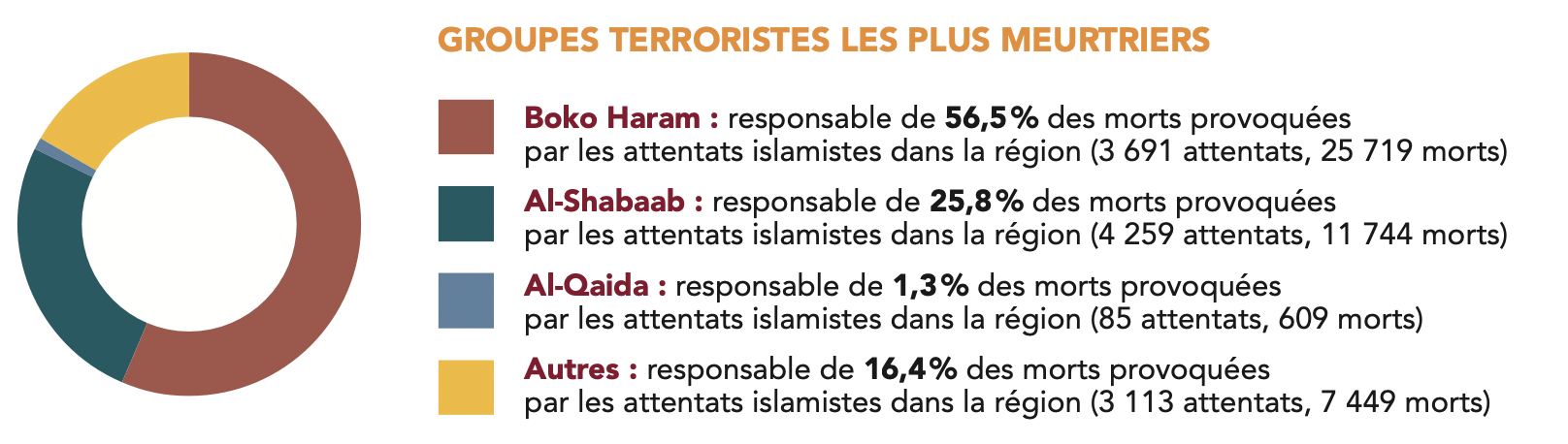 Nos données indiquent qu’entre 2019 et mai 2021 l’Afrique subsaharienne est restée un important foyer du terrorisme islamiste : 862 attentats et 3.893 morts en 2019, 2.005 attentats et 5.099 morts en 2020, 1.962 morts et 1.229 attentats entre janvier et mai 2021. Entre 2019 et mai 2021, Boko Haram est resté le groupe islamiste le plus actif et le plus meurtrier dans la région, avec 1.028 attentats perpétrés (soit 25,1% de l’ensemble des attentats islamistes perpétrés en Afrique subsaharienne), faisant 3.984 morts (36,4% de l’ensemble des morts du terrorisme islamiste en Afrique subsaharienne). Al-Shabaab, avec 489 attentats et 1.282 morts au total sur la période, est le deuxième groupe le plus meurtrier. Les pays les plus touchés sont principalement situés autour de la région du lac Tchad : Nigeria (3.057 morts), Niger (1.268 morts),Burkina Faso (708 morts), Cameroun (662 morts), République démocratique du Congo (630 morts), Mali (629 morts) et Tchad (484 morts). À l’est, la Somalie compte un grand nombre de victimes du terrorisme islamiste (2.420 morts), tout comme le Mozambique (911 morts).