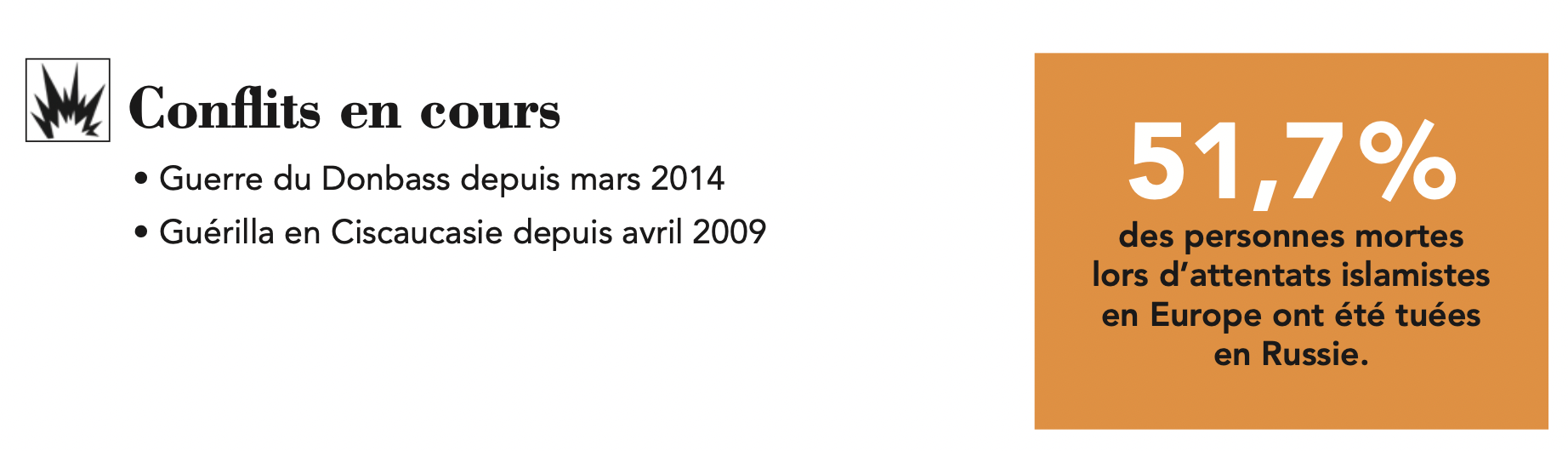 Le 11-Septembre permet aux autorités russes d’intensifier la lutte contre les insurgés tchétchènes. Il s’ensuit une période violente de radicalisation islamiste de la lutte séparatiste, qui étend ses revendications à la création d’un État islamique dans le Caucase du Nord. En moyenne, de 2001 à 2012, le terrorisme islamiste a tué 60 personnes par an. Parmi les 26 attentats ayant frappé le pays au cours de cette période, deux actions terroristes ont particulièrement marqué l’opinion. Le 23 octobre 2002, des membres du groupe djihadiste tchétchène du Special Purpose Islamic Regiment (SPIR) pénètrent dans le théâtre Dubrovka, à Moscou, et prennent 912 civils en otages. Deux ans plus tard, le 1er septembre 2004, un groupe de terroristes s’attaque à une école : 344 personnes, dont beaucoup d’enfants, sont tuées et on dénombre au moins 727 blessés. Cet attentat est revendiqué par le Riyadus-Salikhin Reconnaissance and Sabotage Battalion of Chechen Martyrs, qui recours à l’attentat-suicide. Entre 2013 et mai 2021, le nombre d’actes terroristes a été en hausse, avec 57 attentats et 118 morts, dont 20 ont eu lieu dans la république du Daghestan. La Russie voit même l’État islamique gagner en influence sur ton territoire avec l’émergence de la Province du Caucase de l’État islamique, qui revendique 29 attentats sur la période.