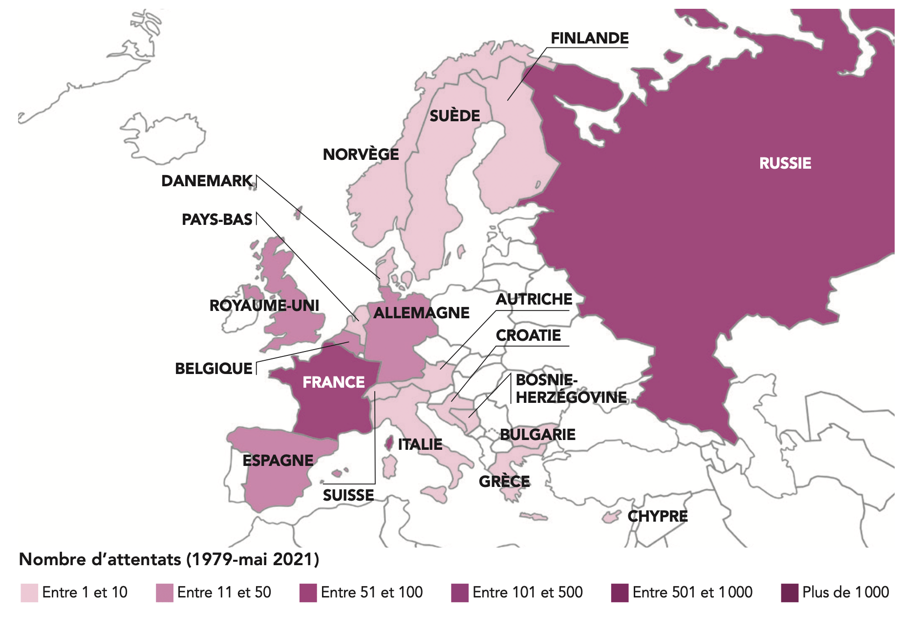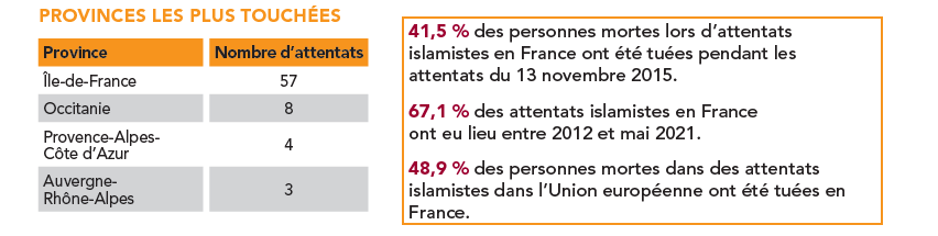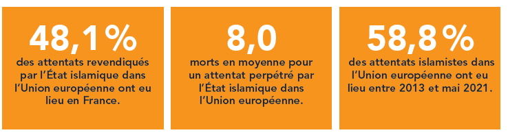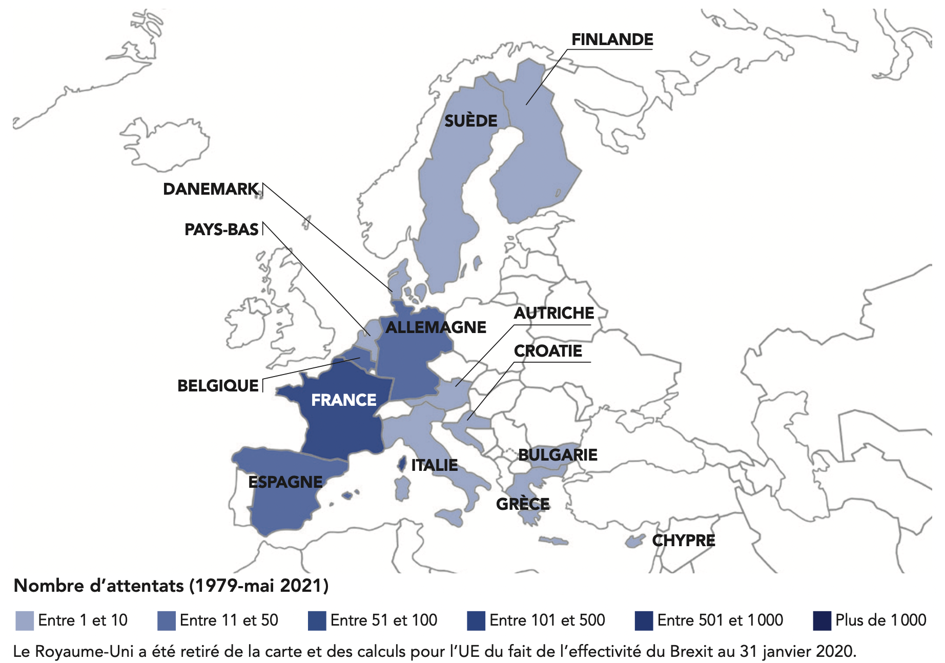La France a été le pays le plus touché de toute l’Union européenne, avec 82 attentats islamistes commis sur son sol entre 1979 et mai 2021. Ces attentats ont fait au moins 330 morts.