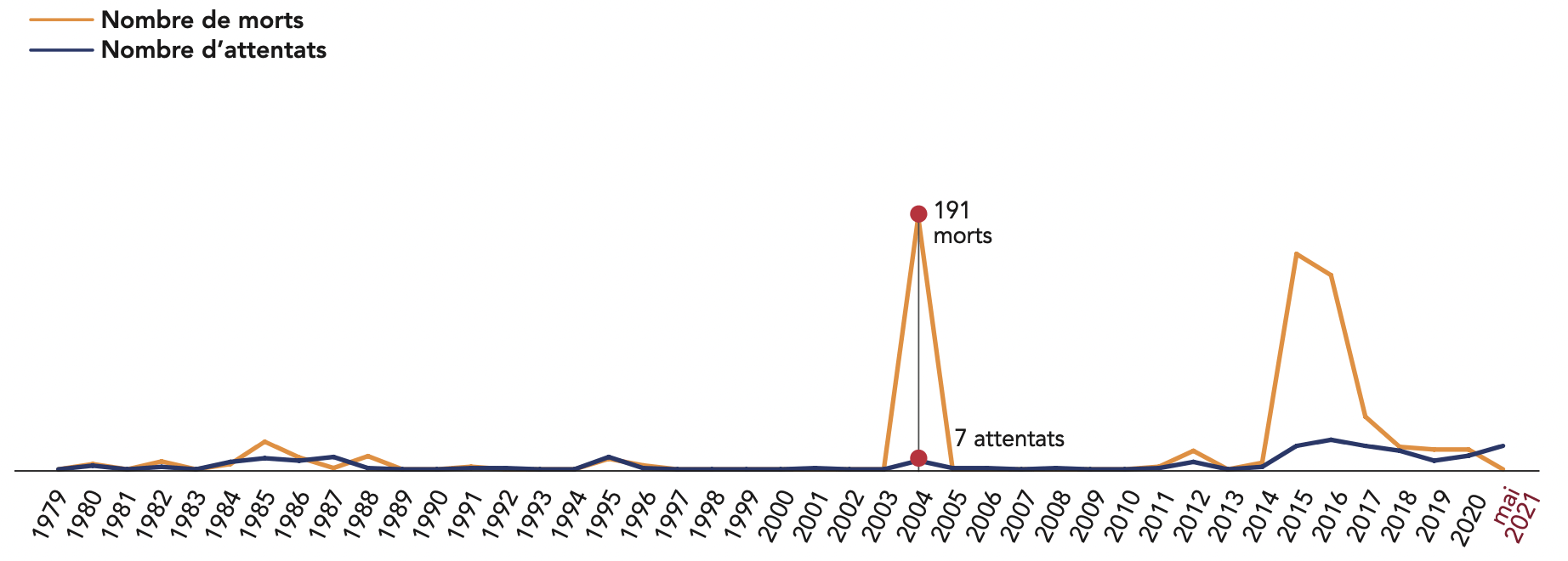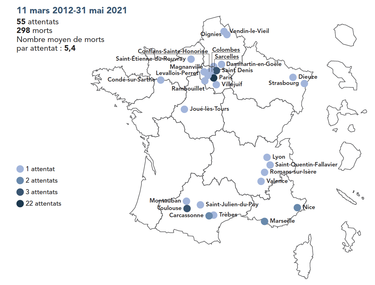 Le 23 avril 2021, un attentat a eu lieu devant le commissariat de Rambouillet en banlieue parisienne. Lors d’une attaque au couteau, une policière a été assassinée. Le meurtrier a été abattu. Cependant, suivant les règles qui ont présidé à la réalisation de notre travail, nous ne pouvons retenir dans les informations avérées de notre base de données sur la violence islamiste ni cet attentat, ni le nombre des victimes puisque nous ne disposons pas des conclusions de l’enquête au moment où nous terminons cette étude.