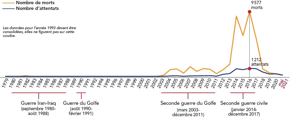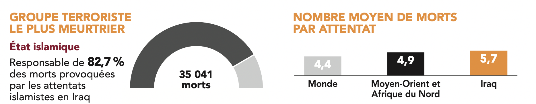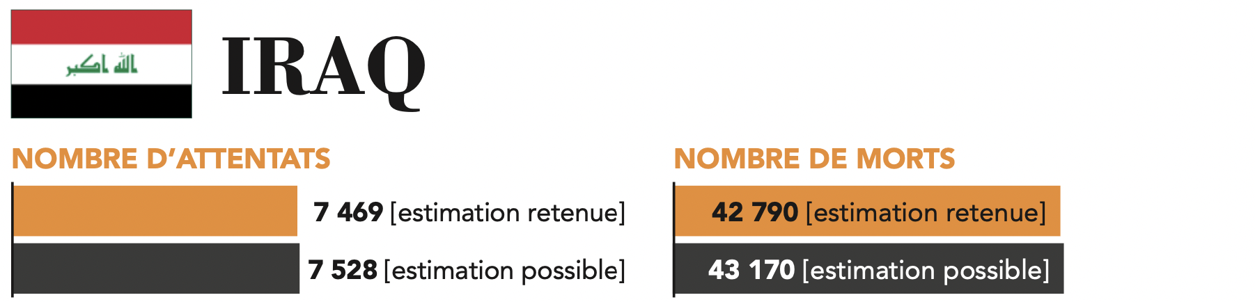 Les territoires les plus touchés sont les lieux où l’EI s’est historiquement implanté, à savoir l’Iraq et la Syrie. Les guerres qui frappent ces États ont facilité son développement en lui permettant de conquérir plusieurs villes et provinces, et de mettre en place un ordre totalitaire animé par l’objectif de rétablir un « califat abbasside ». C’est en Iraq que les terroristes de l’EI sont les plus destructeurs : ils y ont commis 6.539 attentats, provoquant la mort de 35.401 personnes. Cela signifie que sur les 42.790 personnes mortes en Iraq du fait du terrorisme islamiste depuis 1979, 82,7% ont été victimes de l’État islamique entre 2006 et mai 2021.