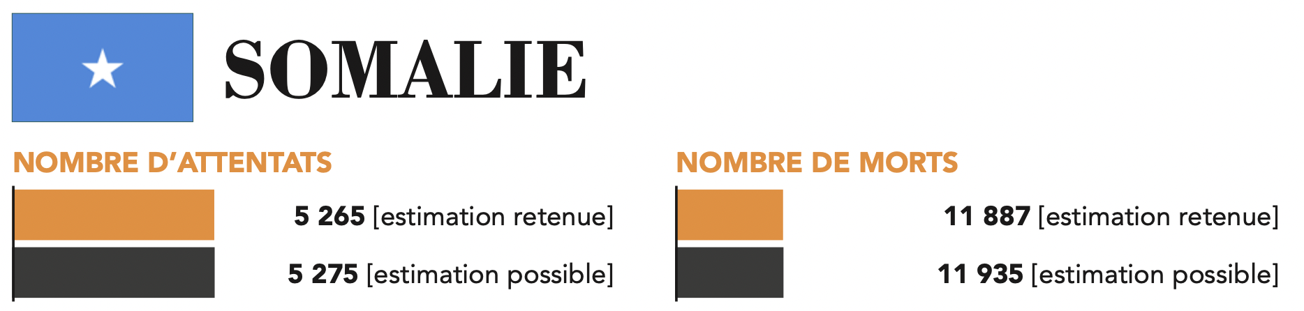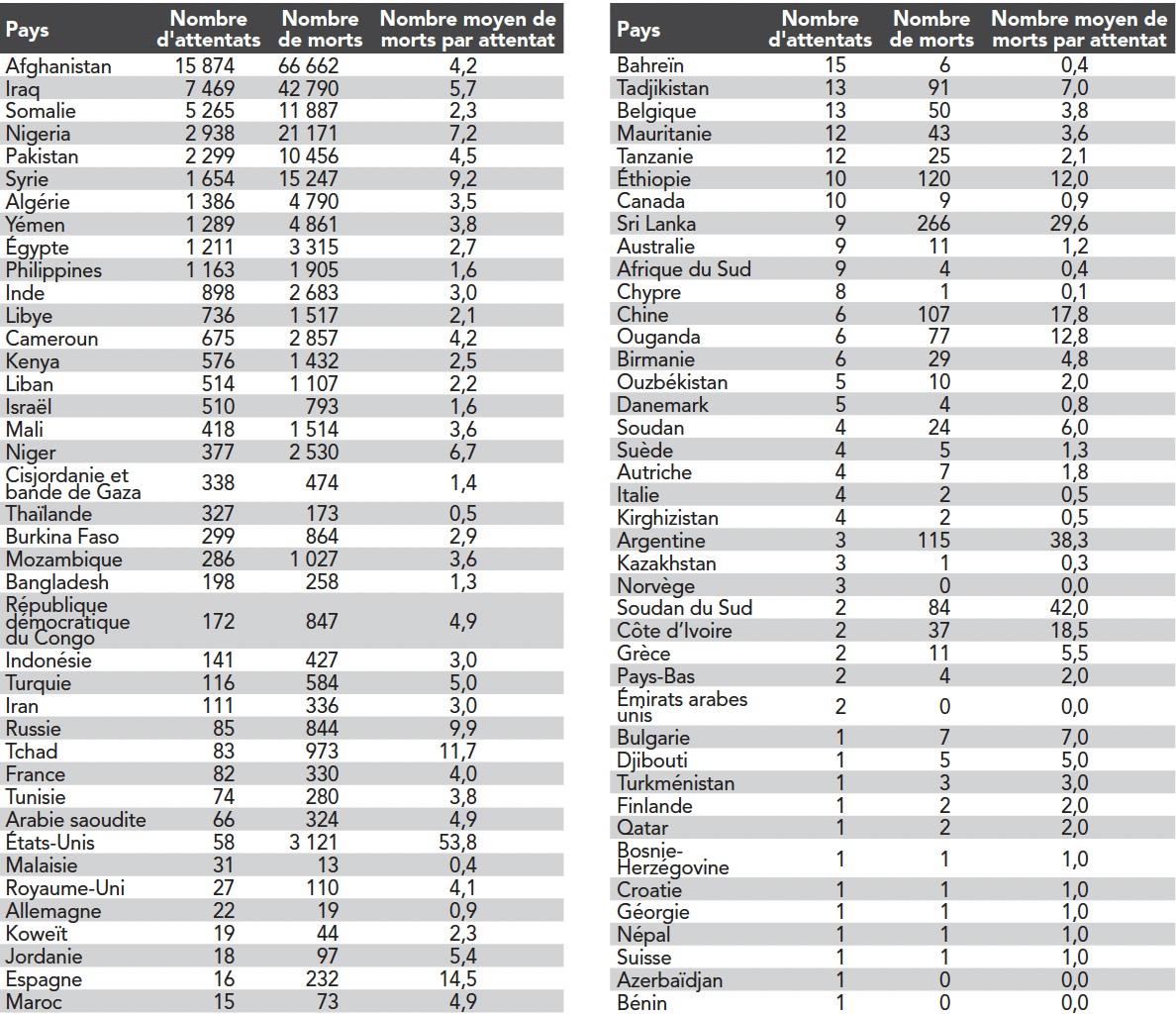Les pays les plus touchés sont l’Afghanistan (15.874 attentats), l’Iraq (7.469 attentats), la Somalie (5.265 attentats), le Nigeria (2.938 attentats), le Pakistan (2.299 attentats), la Syrie (1.654 attentats), l’Algérie (1.386 attentats), le Yémen (1.289 attentats), l’Égypte (1.211 attentats), les Philippines (1.163 attentats), l’Inde (898 attentats), et la Libye (736 attentats).