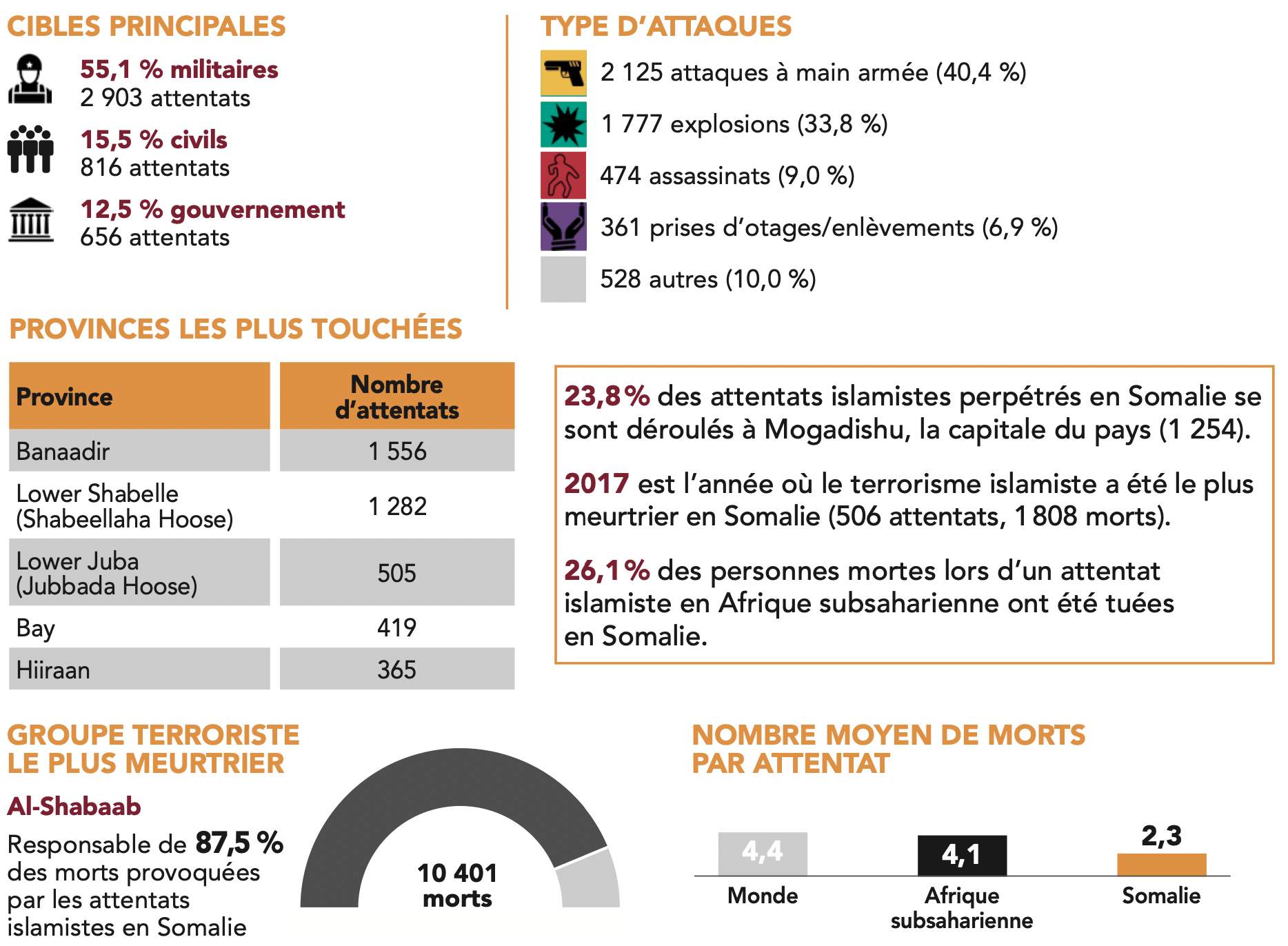 Les militaires sont la cible principale (31,7%) des terroristes islamistes, devant les civils (25,0%) et les forces de police (18,3%).