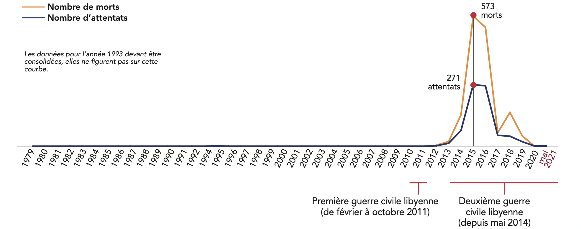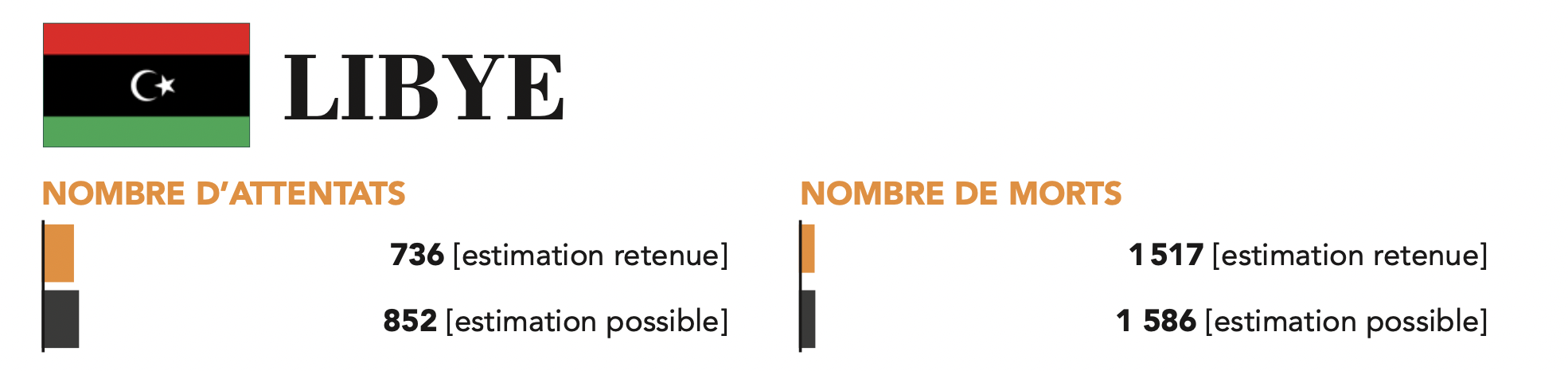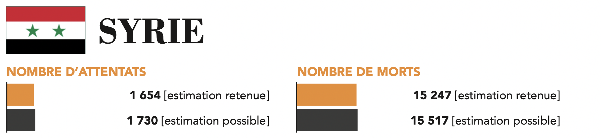 En Syrie, entre 2013 et mai 2021, les attentats de l’État islamique ont été très meurtriers puisque les 996 attaques ont coûté la vie à 9.612 personnes; en moyenne, dans le pays, l’EI provoque la mort de 10 personnes à chacun de ses attentats. Certains pays voisins subissent l’intrusion de l’EI, par ses ramifications, notamment à partir de 2014. Là encore, ces immixtions sont facilitées par des contextes de déstabilisation qui, à leur tour, favorisent l’emprise de l’organisation terroriste sur ces territoires que l’EI regarde comme ses « nouvelles provinces » depuis 2013 : la Libye (571 attentats, 1.160 morts), l’Égypte (733 attentats, 2.253 morts), le Yémen (115 attentats, 997 morts), mais aussi l’Afghanistan (482 attentats, 3.133 morts) et le Pakistan (133 attentats, 768 morts).