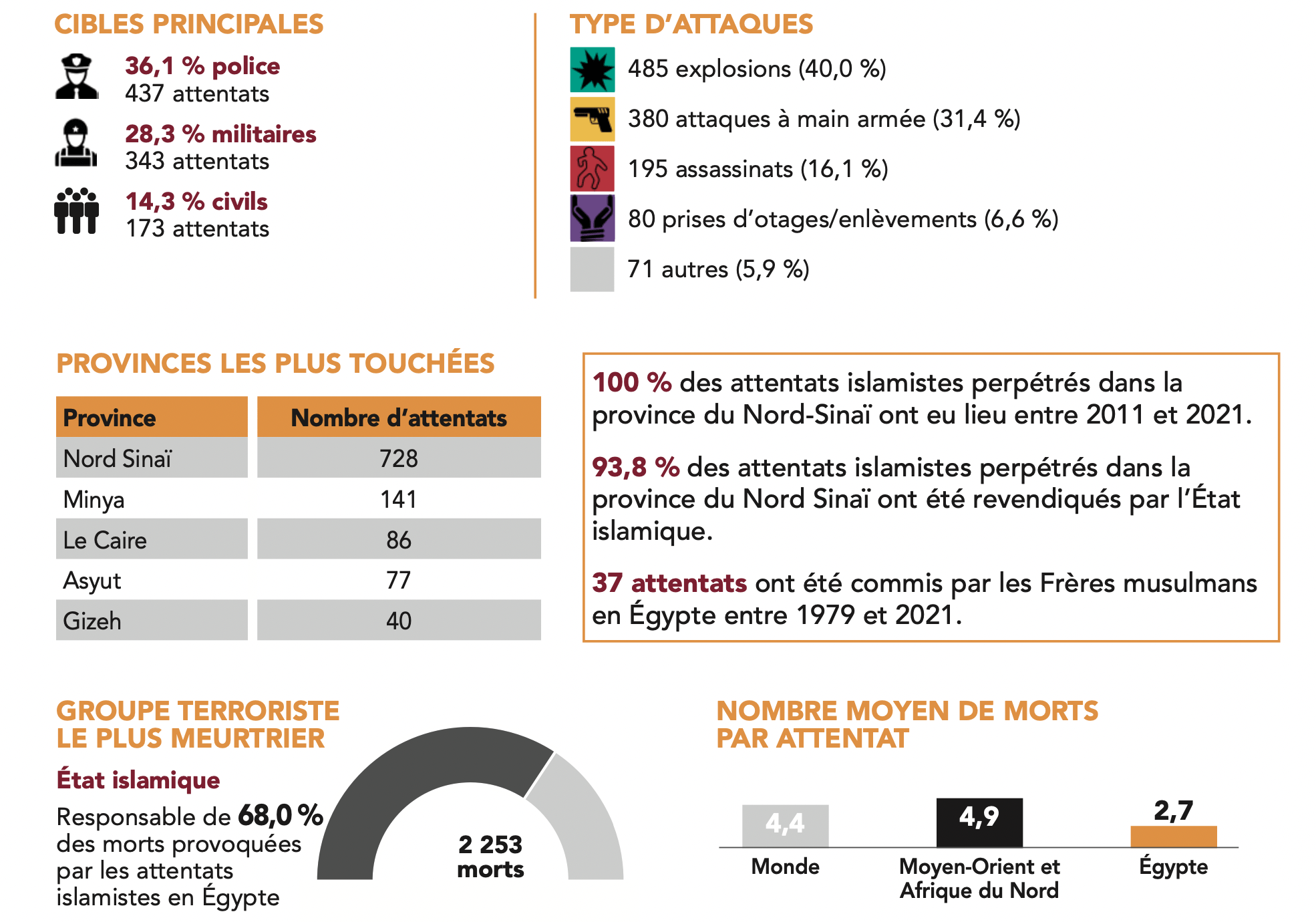 La masse d’informations recueillies éclaire d’un jour nouveau le phénomène de la violence islamiste. Elle permet de mieux la décrire, de mieux la comprendre, de mieux la documenter. Ainsi, malgré toutes les difficultés de cette tâche, nous montrons qu’entre 1979 et mai 2021 au moins 48.035 attentats islamistes ont eu lieu dans le monde. Ils ont provoqué la mort d’au moins 210.138 personnes. En moyenne, un attentat islamiste a causé la mort de près de 4,4 personnes. Nous identifions et quantifions les modes opératoires et les cibles. Les explosifs sont le type d’arme le plus utilisé (43,9%), tandis que les militaires sont la cible principale (31,7%), devant les civils (25,0%) et les forces de police (18,3%). La vision du phénomène se précise, l’image devient plus nette.