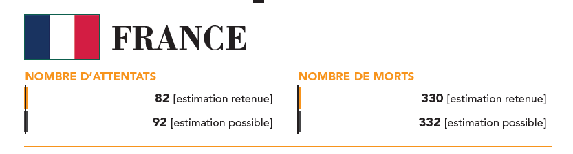 * Lors de la première édition de cette étude, publiée en 2019, les attentats islamistes perpétrés au Royaume-Uni étaient comptabilisés dans la fiche Union européenne. Ce n’est plus le cas dans cette deuxième édition, suite à la sortie effective du Royaume-Uni de l’Union le 31 janvier 2020.