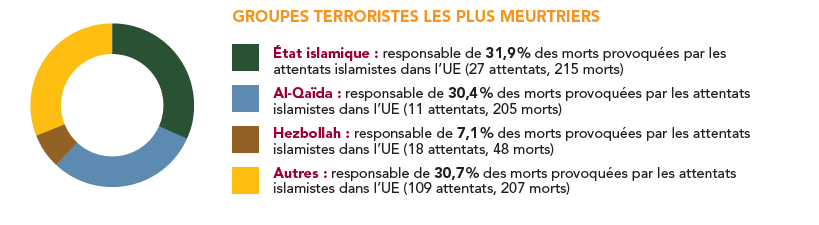 À l’exception de l’Amérique du Sud, les pays des autres continents sont visés par l’EI dans des attentats sur leur territoire aussi bien que contre leurs ressortissants à l’étranger. Plusieurs pays de l’Union européenne sont durement touchés, et la France, avec 13 attentats et 146 morts causés par l’EI, est le pays de l’Union européenne le plus meurtri6.