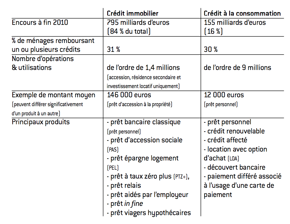 Le crédit aux particuliers repose sur deux catégories principales de produits : le crédit immobilier et le crédit à la consommation.