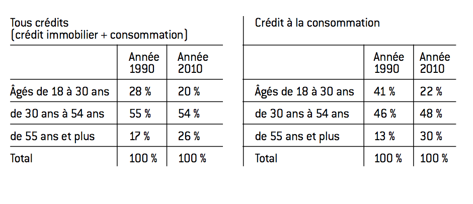 Cette tendance observée pour le crédit en général est encore plus spectaculaire pour le crédit à la consommation. La part des seniors (55 ans et plus) augmente de 13% à 30%. Ce phénomène est très significatif après 65 ans. Selon l’Observatoire des crédits aux ménages, 7% des 65 ans et plus remboursaient un ou plusieurs crédits à la consommation en 1990 ; vingt ans plus tard (2010) ils sont 19%. L’usage du crédit en fonction des générations est différent : sur cent crédits à la consommation remboursés par les plus de 55 ans, 34% concernent l’achat d’une automobile ou moto (contre 51% pour les moins de 30 ans), 30% l’acquisition de biens d’équipement du logement ou la réalisation de travaux (17% pour les moins de 30 ans). Les seniors appartenant aux classes moyennes, et issus de la génération du baby-boom, perpétuent des modes de consommation et un accès au crédit qui étaient les leurs pendant la vie active. En revanche, les générations qui leur succèdent dans le monde du travail restent en deçà en matière d’utilisation du crédit, peut-être parce qu’elles n’ont plus le même niveau de revenus pour certains d’entre eux et qu’elles ne disposent plus des mêmes critères de stabilité. Les générations plus jeunes semblent accéder beaucoup moins rapidement que leurs aînés à la catégorie des classes moyennes.