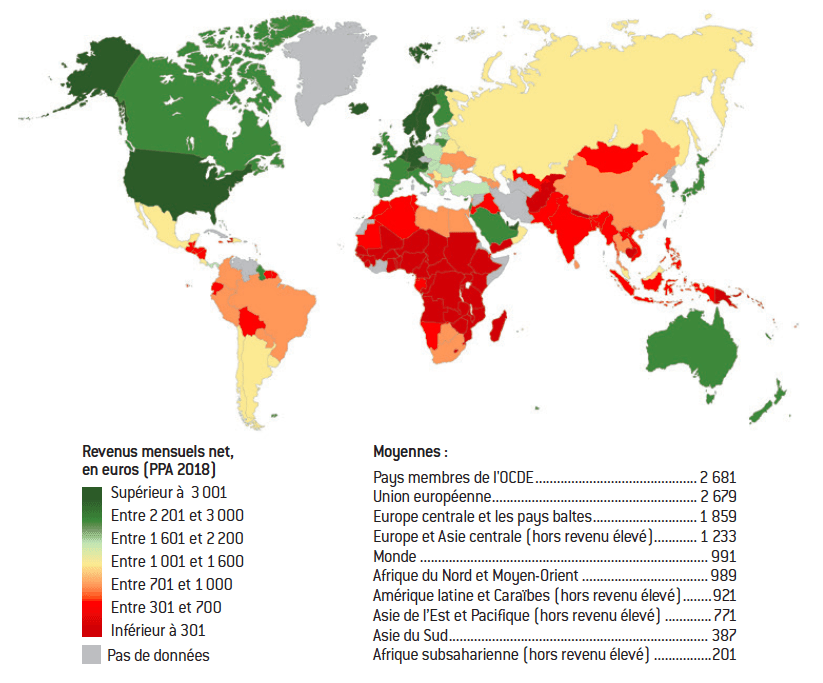Carte des revenus nationaux mensuels nets par habitant, ajustés en PPA, 2018 (en euros actuels)