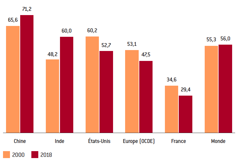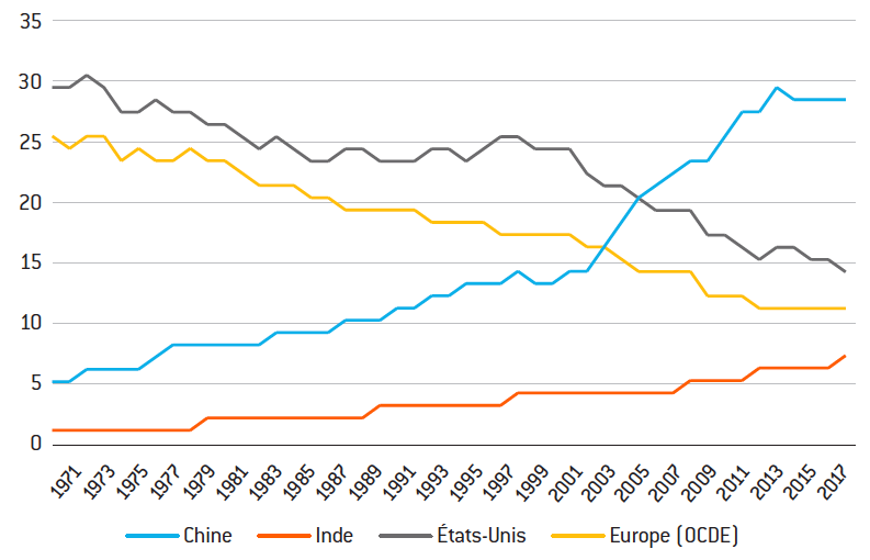 Grille de lecture : La part de la Chine dans le total des émissions mondiales de CO2 est passée d’un peu plus de 5% en 1971 à environ 28% en 2017.