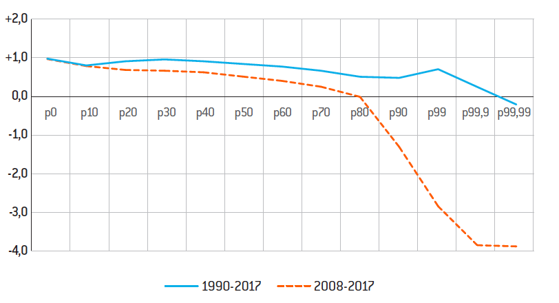 Note : En abscisse sont représentés les différents percentiles de revenu. De p10 à p90 les valeurs sont par déciles avec en p90 l’accroissement des revenus des 10% les plus riches ; p99, p99,9 et p99,99 correspondent respectivement aux 1%, 0,1% et 0,01% les plus aisés.