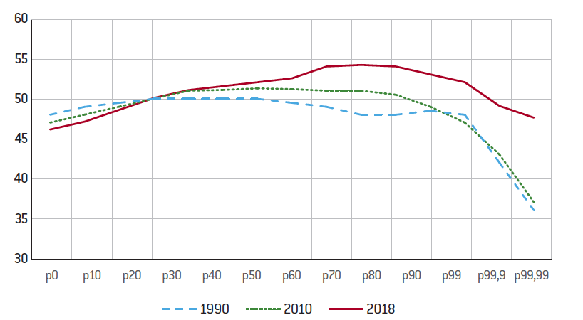 Grille de lecture : Le taux de taxation général des adultes appartenant aux 1% les plus aisés (p99) était de 48,5% en 1990, 49% en 2010 et 53% en 2018. L’ensemble des taxes payées par les adultes appartenant aux 0,01% les plus aisés (p99,99) était de 36% en 1990, 37% en 2010 et 47,5% en 2018.