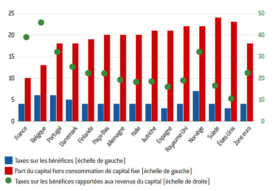 Grille de lecture : En France, les taxes sur les bénéfices et la part du capital des entreprises non financières représentent respectivement 4 % et 10 % de la valeur ajoutée en 2017 (échelle de gauche). Les taxes sur les bénéfices représentent 40 % des revenus du capital des entreprises (échelle de droite).