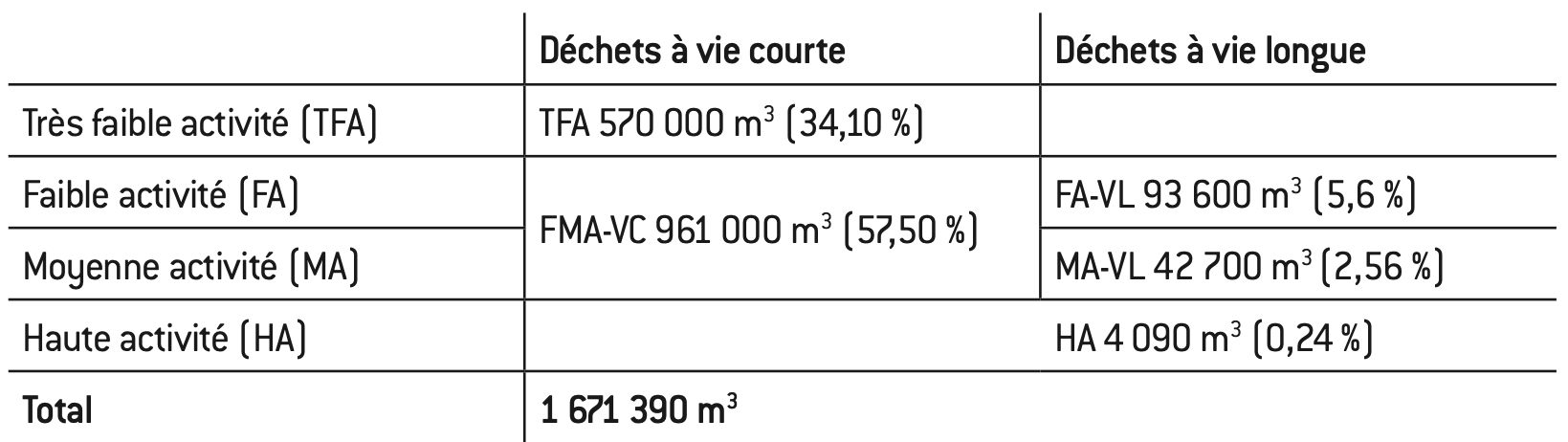 Environ 60% de tous ces déchets nucléaires produits en France ces dernières décennies sont directement liés au secteur électronucléaire, les autres proviennent de la recherche (dont une part significative consacrée à l’électronucléaire), de la défense, de l’industrie non électronucléaire et du médical17. Les déchets TFA et FMA-VC représentent plus de 90% des volumes globaux du 1,67 million de mètres cubes. Pour autant, ils ne pèsent que pour une part très réduite de la radioactivité, à l’inverse des déchets HA.