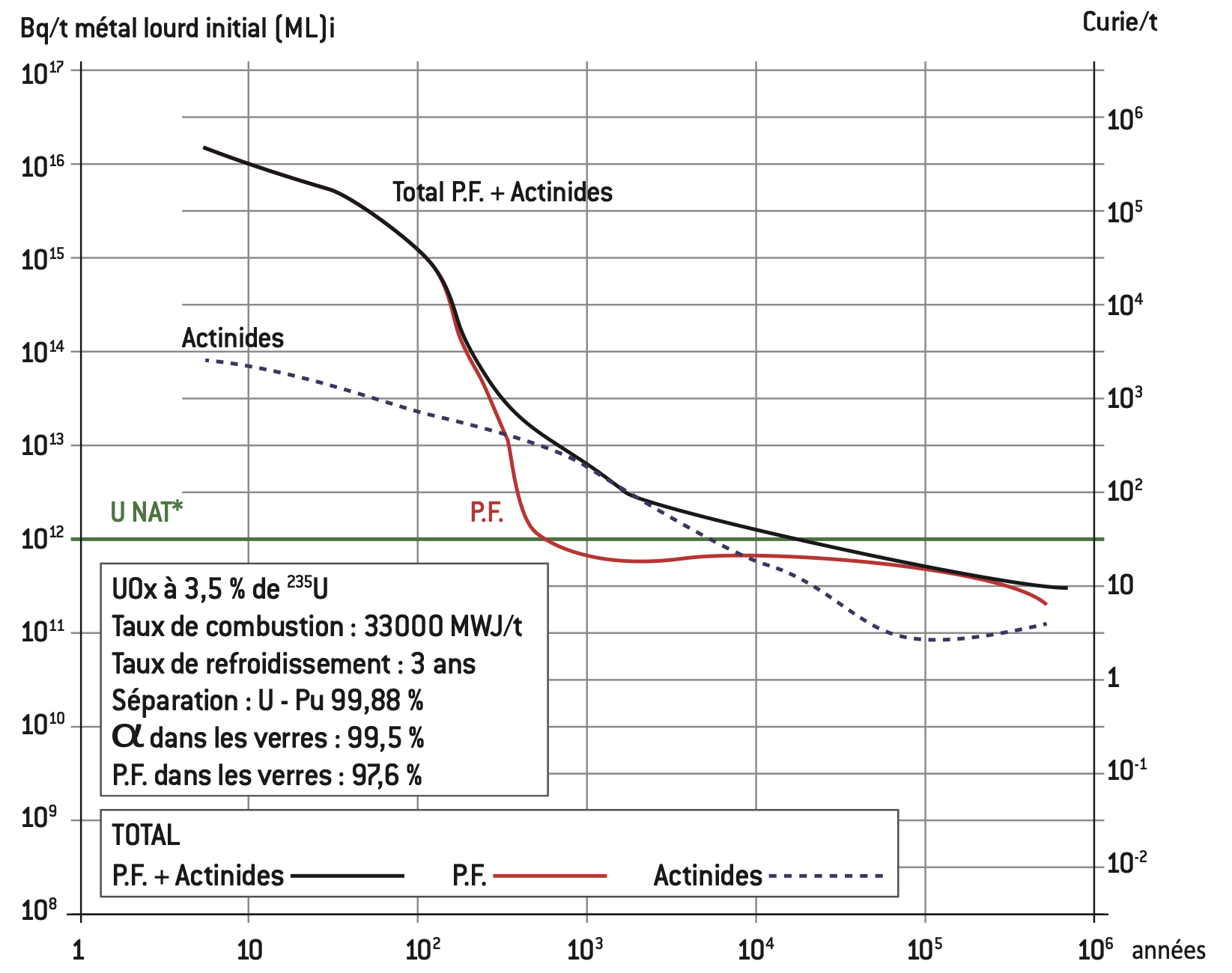 Les produits de fission ont une décroissance rapide, ils rejoignent le niveau d’activité du minerai d’uranium en quelques centaines d’années (autour de 500 ans), les verres en 10.000 ans et les combustibles usés (avec le plutonium) en un peu plus de 100.000 ans.