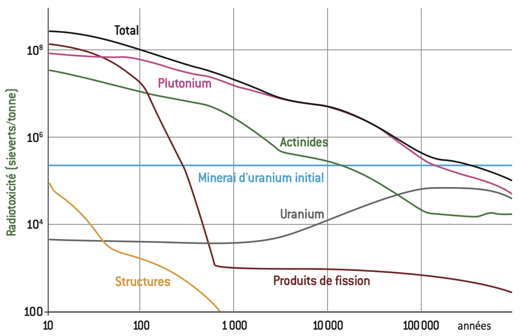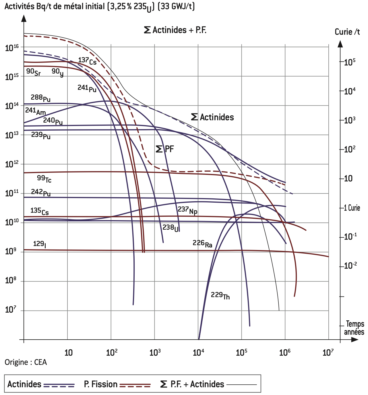 Dans le combustible usé, les produits de fission à vie courte et émetteurs γ (comme le césium de demi-vie de 30 ans), et émetteurs β énergiques (comme le strontium de même demi-vie) font l’essentiel de l’activité les 500 premières années. Puis l’américium 241 (période de 432 ans) prend le relais, jusqu’à 2.000 ans, et le plutonium 239 (24.000 ans) de 2.000 à 100.000 ans, tous deux émetteurs α. Le technétium 99 (213.000 ans), produit de fission et émetteur β de faible énergie, domine de 100.000 à 1 million d’années, avant la reprise par d’autres actinides α à demi-vie encore plus longue comme le neptunium 237.
