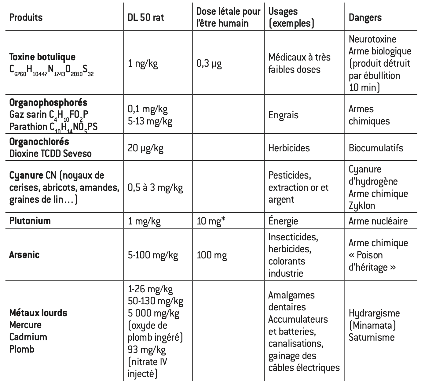 Ces produits, à dose significative, sont à l’origine d’effets toxiques aigus ; à dose plus faible mais répétée dans le temps, ils sont à l’origine de toxicités chroniques et ils peuvent présenter aussi, à l’exception de la toxine botulique, des effets cancérogènes ou mutagènes. Les DL 50 (doses létales à 50% à l’ingestion en grammes, milligrammes ou microgrammes par kilo) pour le rat sont bien sûr un indicateur de toxicité très insuffisant et trop spécifique, mais il permet d’illustrer l’encadrement des déchets nucléaires les plus toxiques à long terme (comme le plutonium) par ces substances chimiques considérées comme des déchets dangereux, dont les quantités utilisées, rejetées pour une part dans l’atmosphère, l’eau ou les sols, sont souvent de plusieurs ordres de grandeur plus importantes.