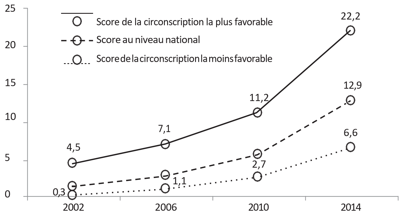 Le score des Démocrates de Suède a toujours varié considérablement d’une région du pays à l’autre. Dans les vingt-neuf circonscriptions parlementaires, ils ont déjà obtenu des résultats sensiblement supérieurs ou inférieurs à leur moyenne nationale. Le graphique 2 montre le score dans la circonscription où ils ont obtenu la représentation la plus élevée et la plus faible, entre 2002 et 2014, avec le résultat national de l’année correspondante comme point de référence.