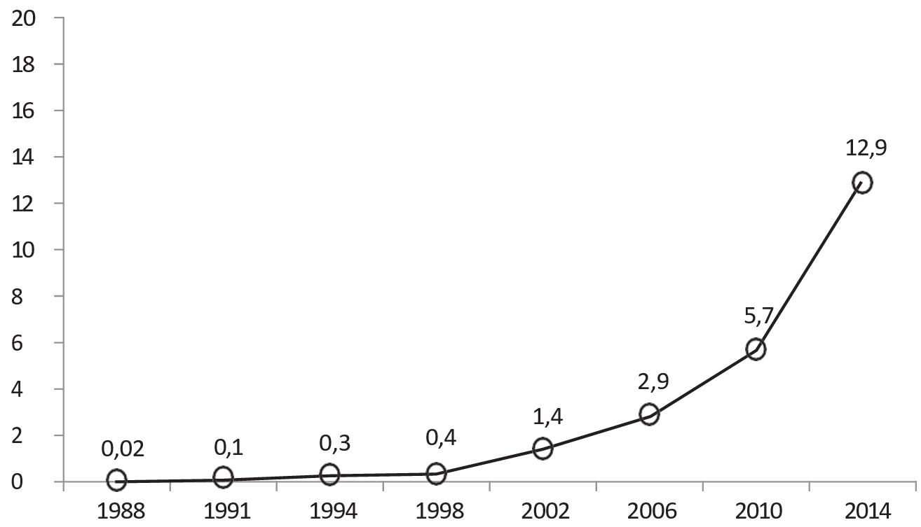 Graphique 1 : Le score des Démocrates de Suède aux élections législatives (1988-2014, en % des suffrages exprimés).