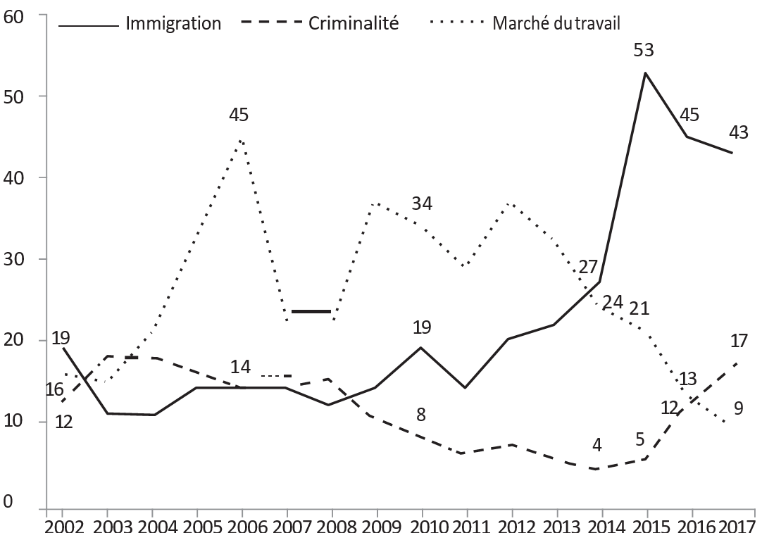 Graphique 4 : La préoccupation publique pour les enjeux liés à l’immigration, à la criminalité et au marché du travail en Suède (1990-2017)