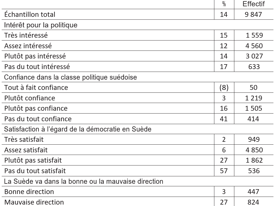Dans le tableau 3, nous rencontrons un autre modèle explicatif connu du vote en faveur des Démocrates de Suède, à savoir le lien avec le degré de confiance dans le personnel politique. Parmi les Suédois qui déclarent faire très peu confiance à la classe politique suédoise, le niveau de soutien aux Démocrates de Suède est de 41% ; il est de seulement 3% parmi les Suédois interrogés qui disent leur accorder une confiance assez élevée. Il en va de même en ce qui concerne le lien avec le degré de satisfaction quant au fonctionnement de la démocratie. Le soutien aux Démocrates de Suède est beaucoup plus élevé au sein du groupe des répondants qui disent être insatisfaits de la manière dont fonctionne la démocratie en Suède, et il atteint pas moins de 57% parmi ceux qui ne sont pas du tout satisfaits de ce fonctionnement. Pourtant, il est important de se rappeler ici que la direction causale est loin d’être claire. Ce schéma n’est pas nécessairement le résultat d’un processus qui verrait ceux qui sont les moins satisfaits de la démocratie ou qui perdent leur confiance dans la classe politique devenir plus susceptibles de voter pour les Démocrates de Suède. La causalité inverse est tout aussi possible et, selon certaines études, encore plus probable41.