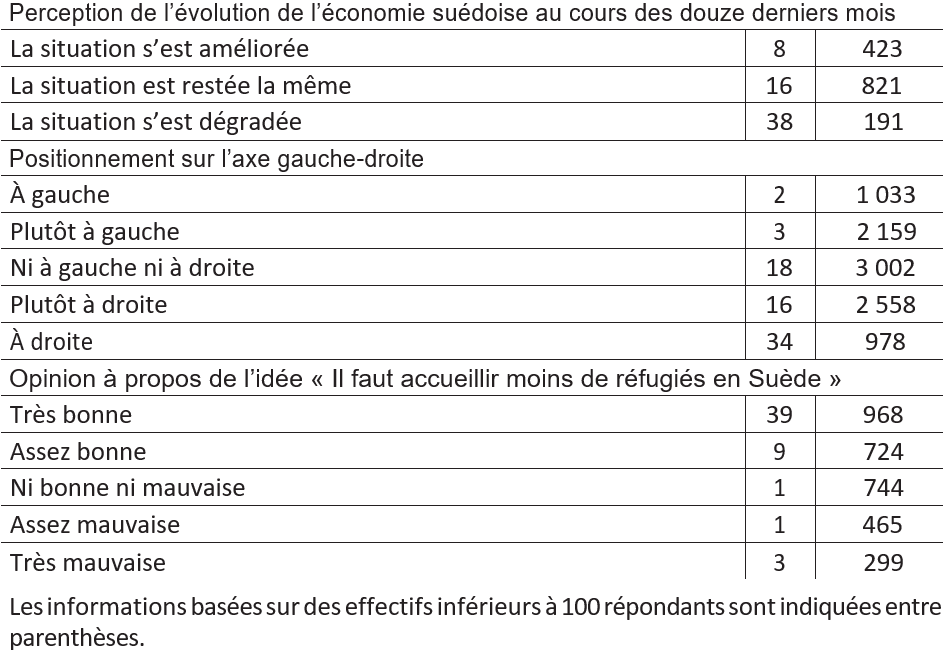 Dans l’une des premières monographies consacrées aux électeurs du SD, Sören Holmberg montrait que si les Démocrates de Suède appartiennent plus souvent que les électeurs des autres formations politiques à des groupes sociaux économiquement défavorisés, ils se caractérisent surtout par une défiance envers la classe politique, des réactions négatives envers l’immigration et les réfugiés, et qu’ils ont tendance à considérer l’immigration et la criminalité comme les problèmes majeurs du pays, à la différence de la plupart des autres électeurs27.