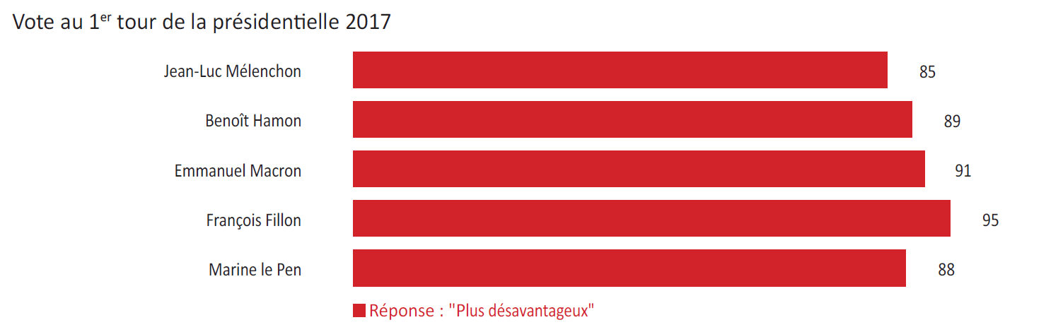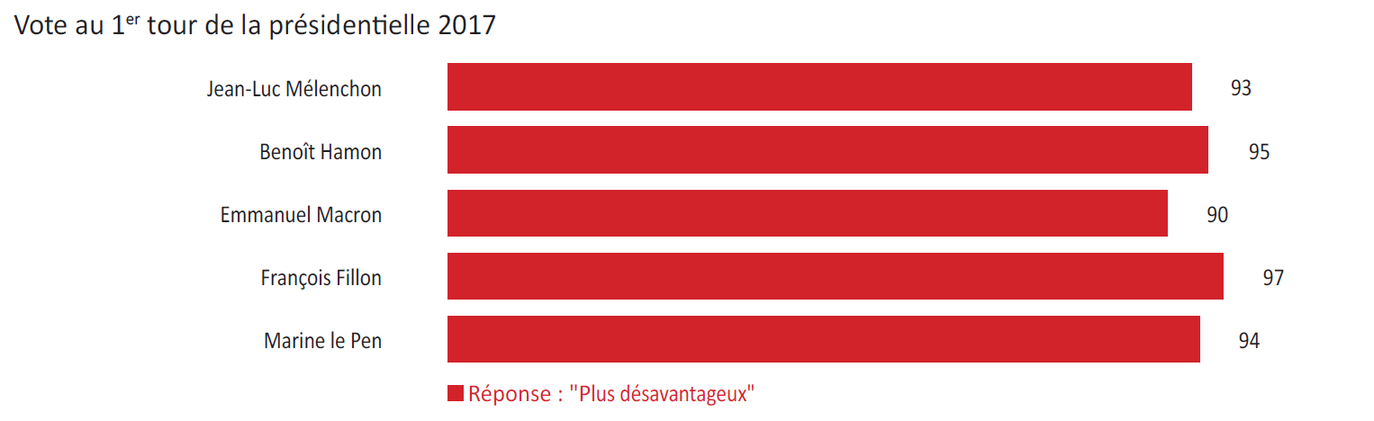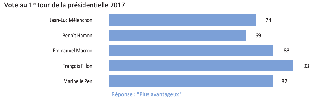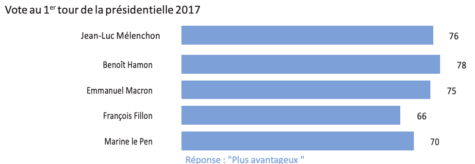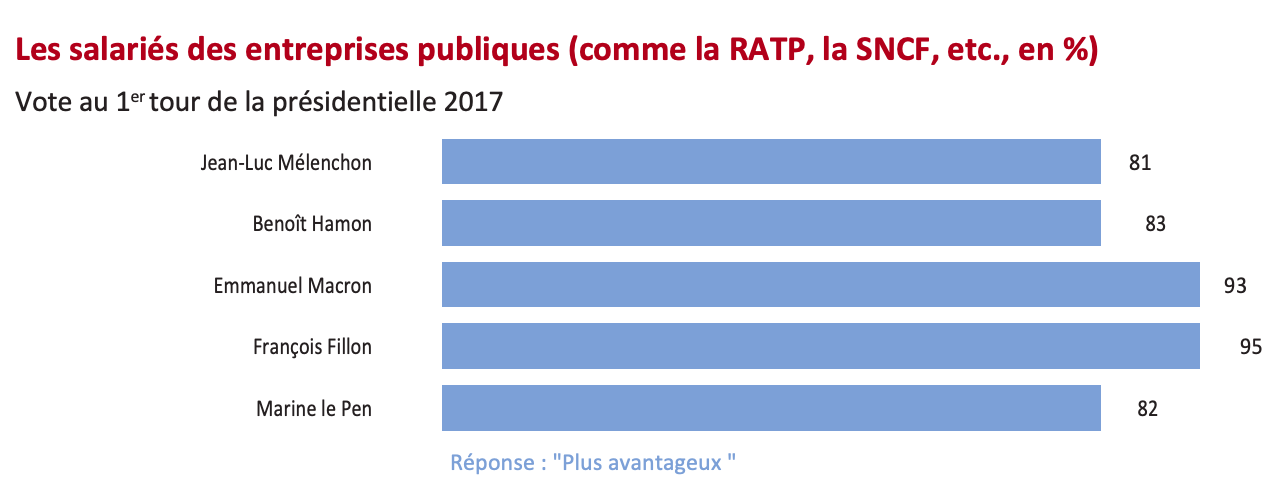 De plus, si la quasi-totalité (96%) des personnes qui se déclarent proches de la droite jugent le régime de retraite des salariés des entreprises publiques, telles que la SNCF ou la RATP, plus avantageux que celui des autres retraités, cette opinion est cependant partagée par une écrasante majorité de ceux qui se déclarent proches de la gauche (80%), y compris parmi les proches de La France Insoumise (76%), du Parti socialiste (89%) ou encore parmi les électeurs de Jean-Luc Mélenchon (81%) et de Benoît Hamon (83%). Enfin, 93% des personnes proches de La République En Marche jugent plus avantageux le régime de retraite des salariés des entreprises publiques.