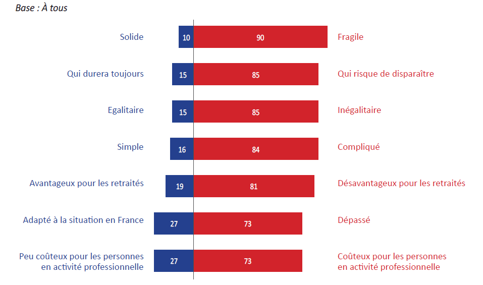 La quasi-totalité des personnes interrogées considèrent que le système de retraite actuel est fragile (90%), inégalitaire (85%), compliqué (84%) et dépassé (73%).