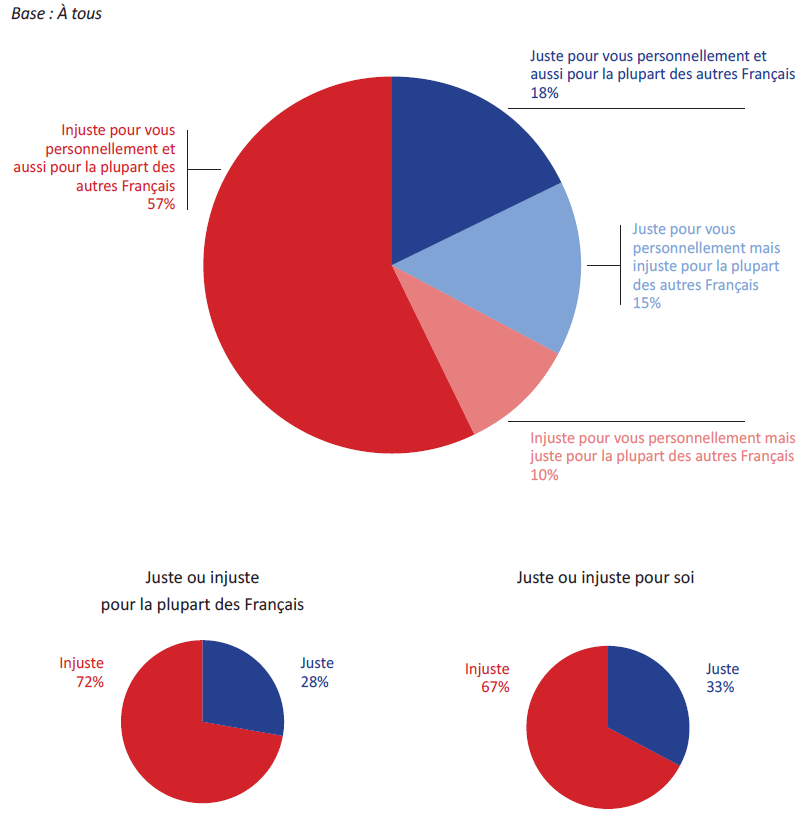 (Juste pour vous personnellement et aussi pour la plupart des Français / Juste pour vous personnellement mais injuste pour la plupart des autres Français / Injuste pour vous personnellement mais juste pour la plupart desautres Français / Injuste pour vous personnellement et aussi pour la plupart des autres Français) (%)