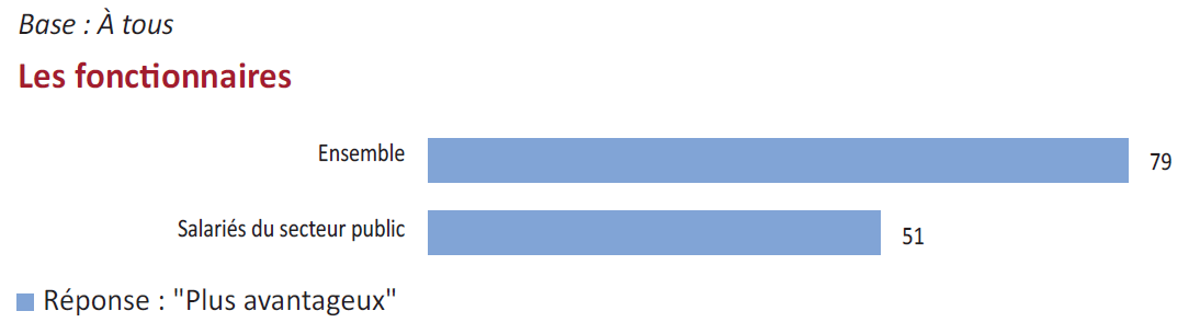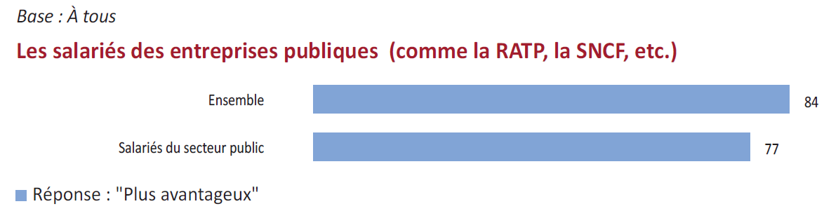 Les différences entre les régimes de retraite n’apparaissent pas justifiées pour 79% des personnes interrogées. Le système de retraite des salariés des entreprises publiques (RATP, SNCF…) est considéré plus avantageux par 84% des personnes interrogées, de même que le système de retraite des fonctionnaires est jugé plus avantageux par 79% des répondants.