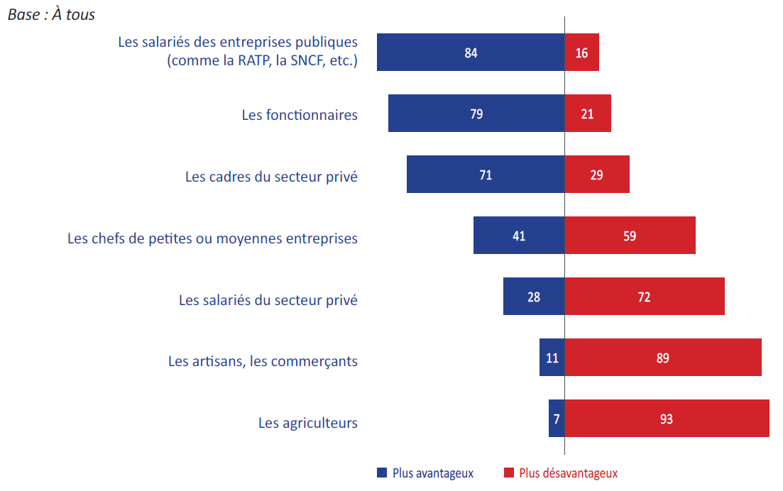 Inversement, la plupart des personnes répondent que le système actuel de retraite est plus désavantageux pour les agriculteurs (93%), pour les artisans et les commerçants (89%) et pour les salariés du privé (72%) et les chefs de petites et moyennes entreprises (59%).
