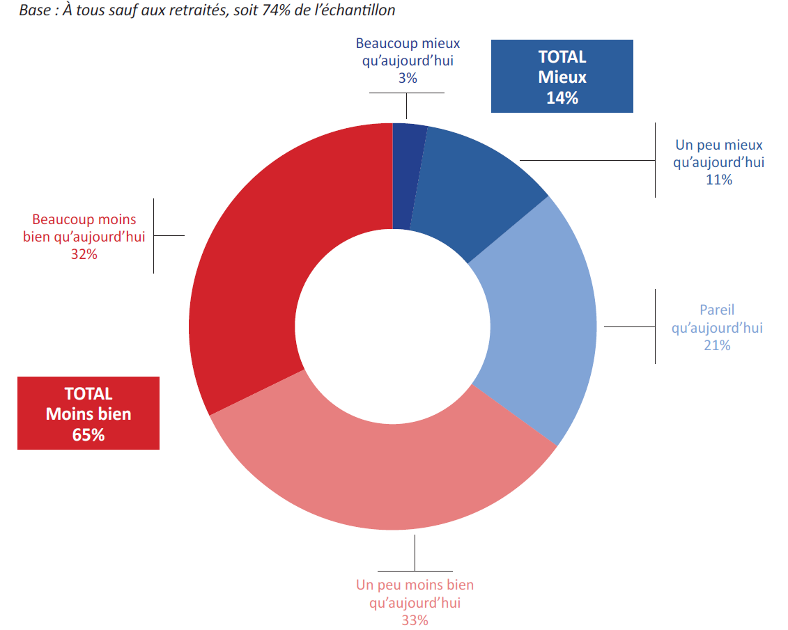 Parmi les Français qui ne sont pas encore à la retraite, une large majorité jette un même regard inquiet sur leur futur niveau de vie à la retraite : près des deux tiers desrépondants (65%) estiment que, même « en termes de revenu et de patrimoine », ils vivront moins bien. L’idée d’une dégradation continue du système actuel des retraites se retrouve dans la conviction, très largement partagée par les Français (85%), qu’il risque de disparaître.
