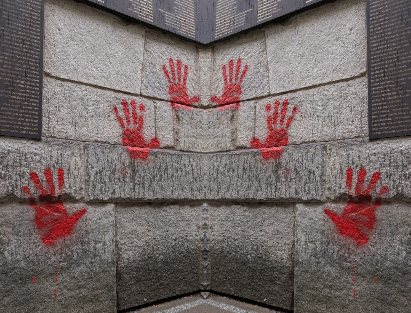 Mur des Justes du Mémorial de la Shoah, à Paris. Dans un acte de vandalisme, des mains rouges ont été apposées sur le Mur, au cours de la nuit du 13 au 14 mai 2024. Ces mains renvoient au lynchage de deux soldats israéliens dans un commissariat palestinien, à Ramallah, en 2000. À la suite du massacre, un homme s’était alors présenté à la foule en exhibant triomphalement ses mains rouges du sang des victimes. L’acte de vandalisme du Mur des Justes est donc aussi un appel à la violence antisémite.