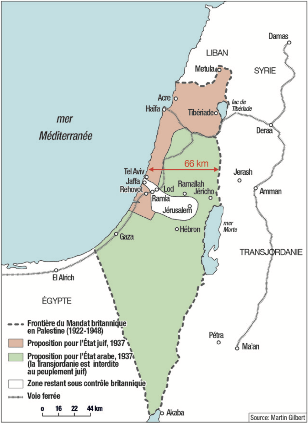 Projet de partition de la Commission Peel, 1937 Distance entre la mer et le fleuve Jourdain